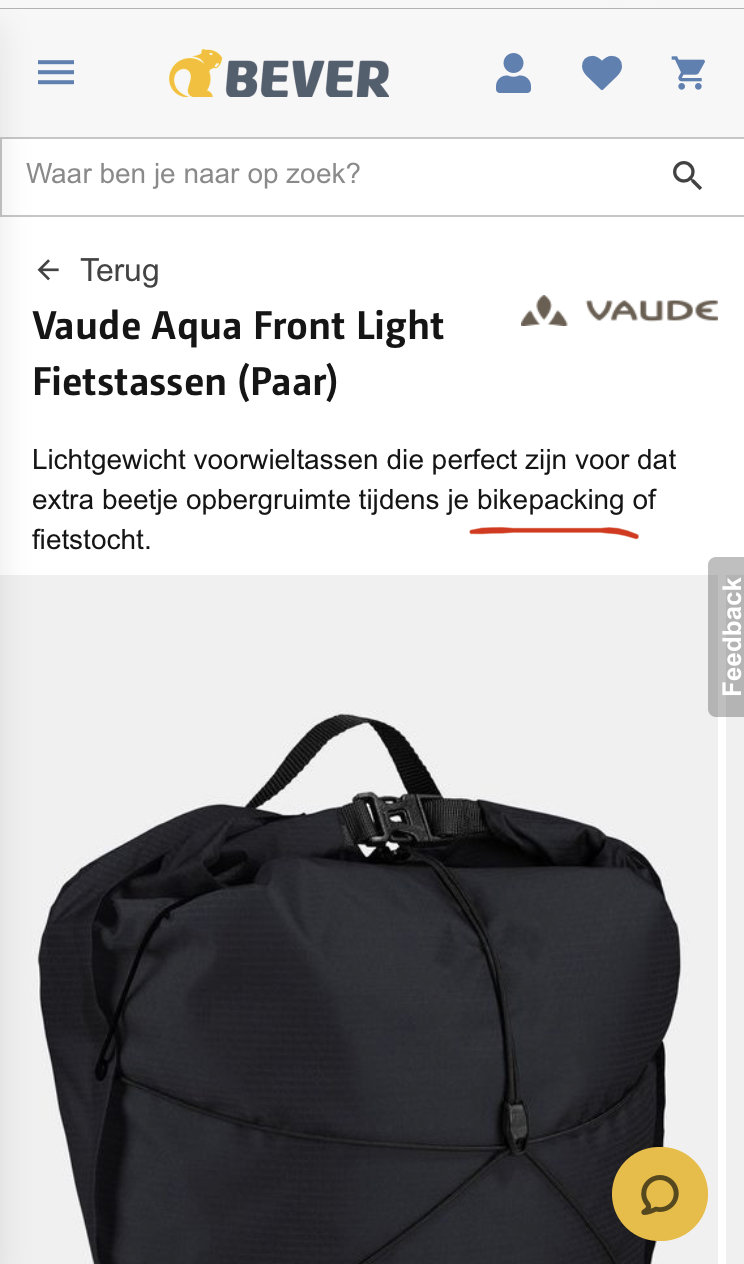 Zo is het ook onhandig als je routes zoekt speciaal voor bikepacking (bv moeilijke offroad-paden) en dan asfalt-routes krijgt omdat men 't verschil niet weet tussen bikepackers en 'gewone' toerfietsers. Andersom hetzelfde verhaal natuurlijk, denk niet dat je met dikke zijtassen zit te wachten op MTB-bergpaadjes. Of je zoekt superlichte kampeerspullen voor je bikepacksetup en men komt met een grote tent ... etcetc.
