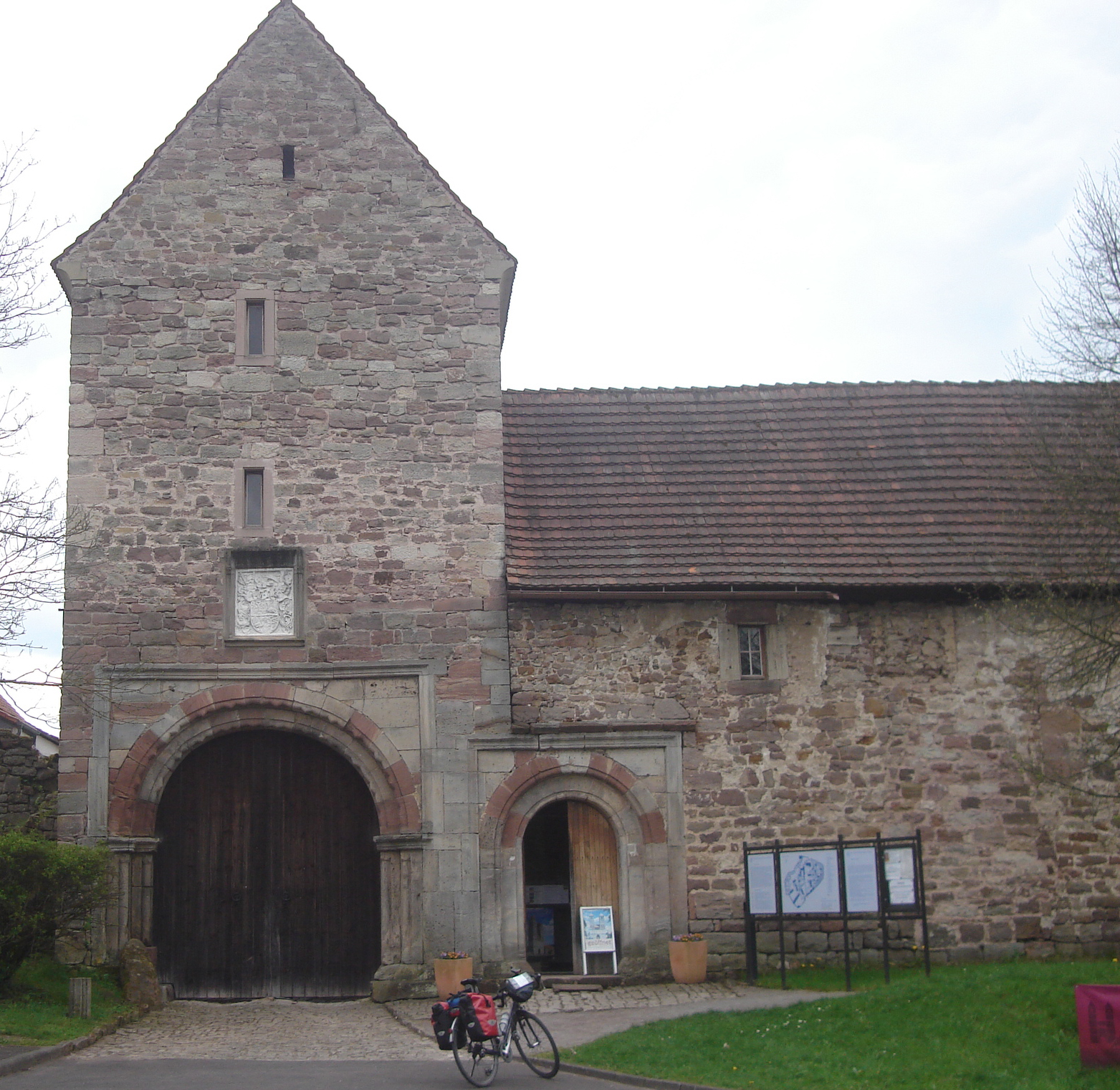 Geen idee, maar wel merkwaardig dat een heel eenvoudig gebouw rijk versierde Romaanse boogdeuren heeft. Die typische dakpannen met een dubbele rij "visschubben" aan de onderkant (vind ik heel mooi) heb ik heel vaak aangetroffen in Oost-Duitsland, de voormalige DDR, maar ook gezien in Praag.