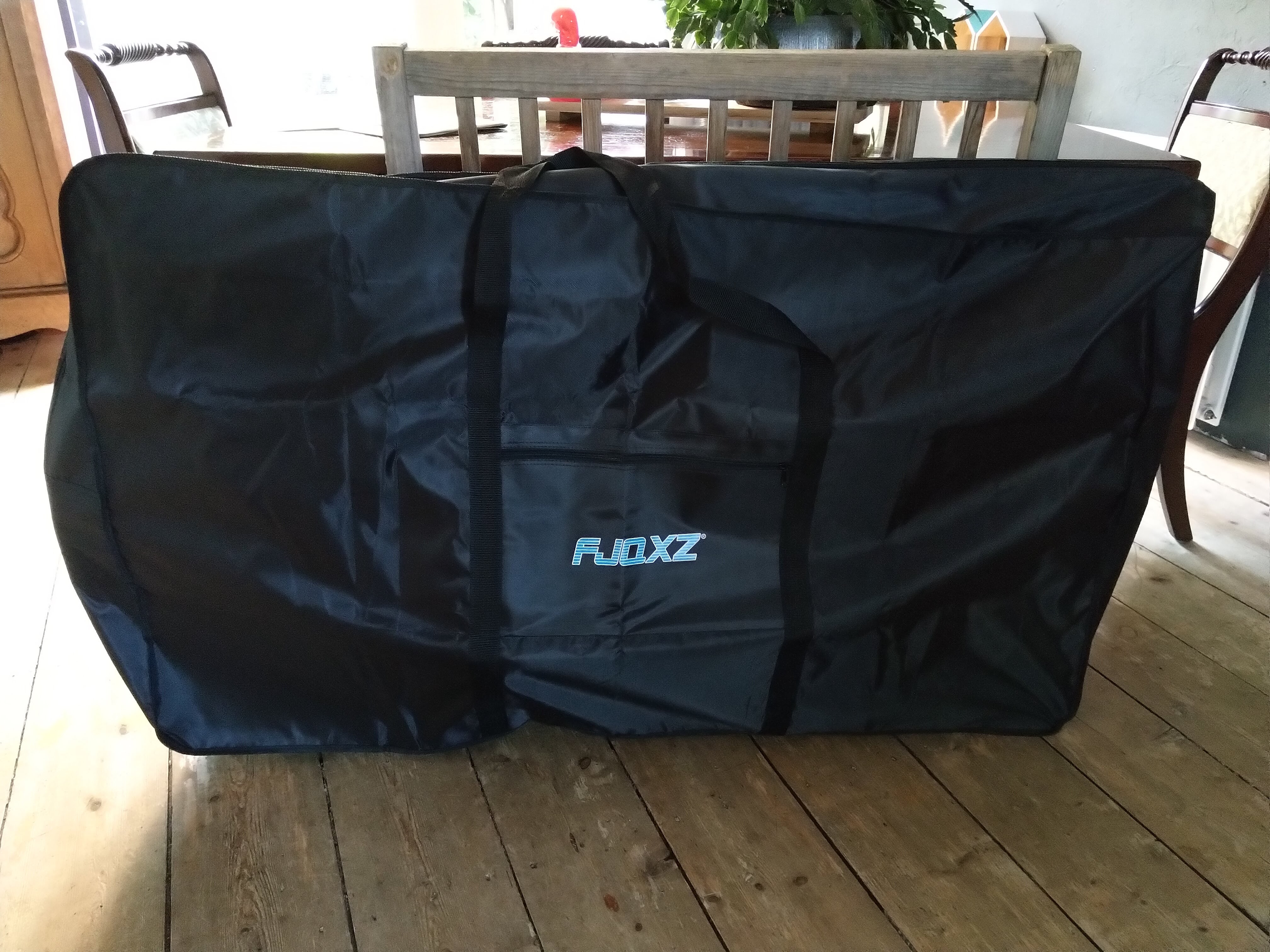 Ik had een fietshoes. Moet mijn stuur draaien en voorwiel eruit halen (snelspanner). De hoes is herbruikbaar en nylon.