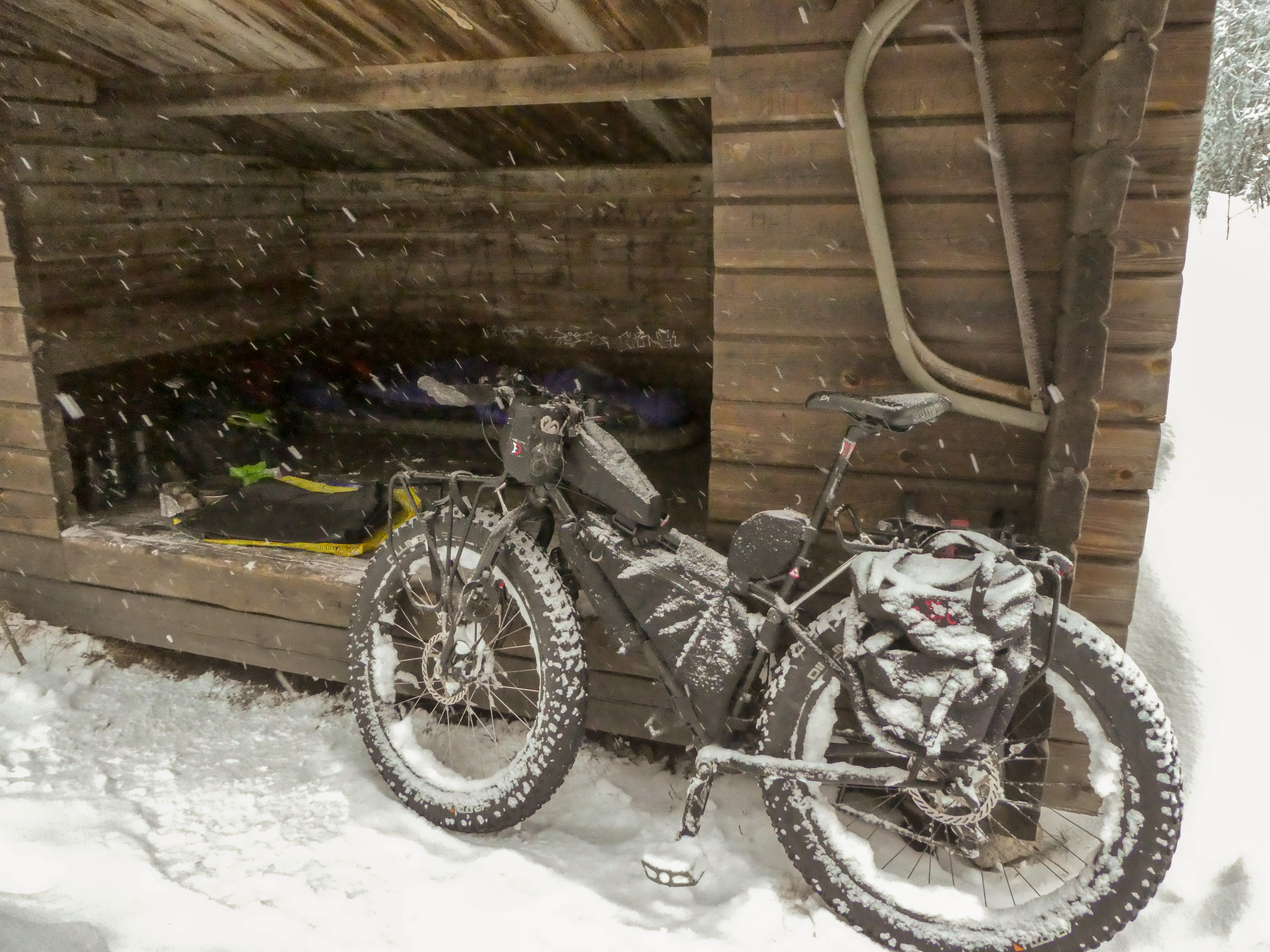 De fatbike slaapt meestal languit in de sneeuw naast de tipi. Een lange stok zoeken om hem te ondersteunen is een heel gedoe in diepe sneeuw, je wordt alleen maar koud en de sneeuw dringt in je laarzen, handschoenen, mouwen etc. Vaak zitten stokken ook vastgevroren in een dikke ijssneeuwlaag en tis zowiezo nog de vraag of het zou helpen want bij nieuwe sneeuwval verdwijnt de fiets toch.