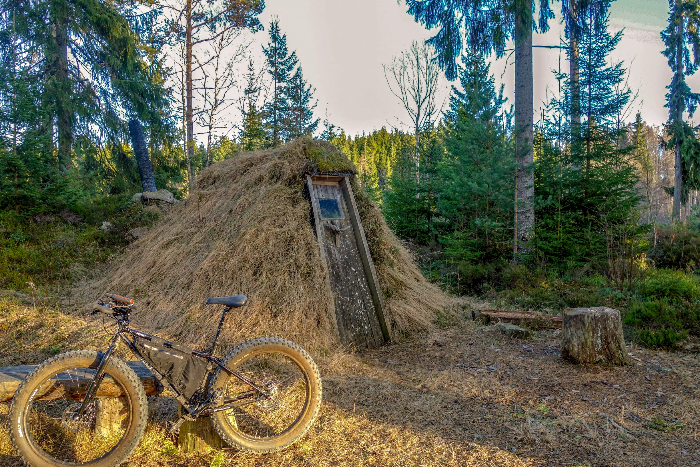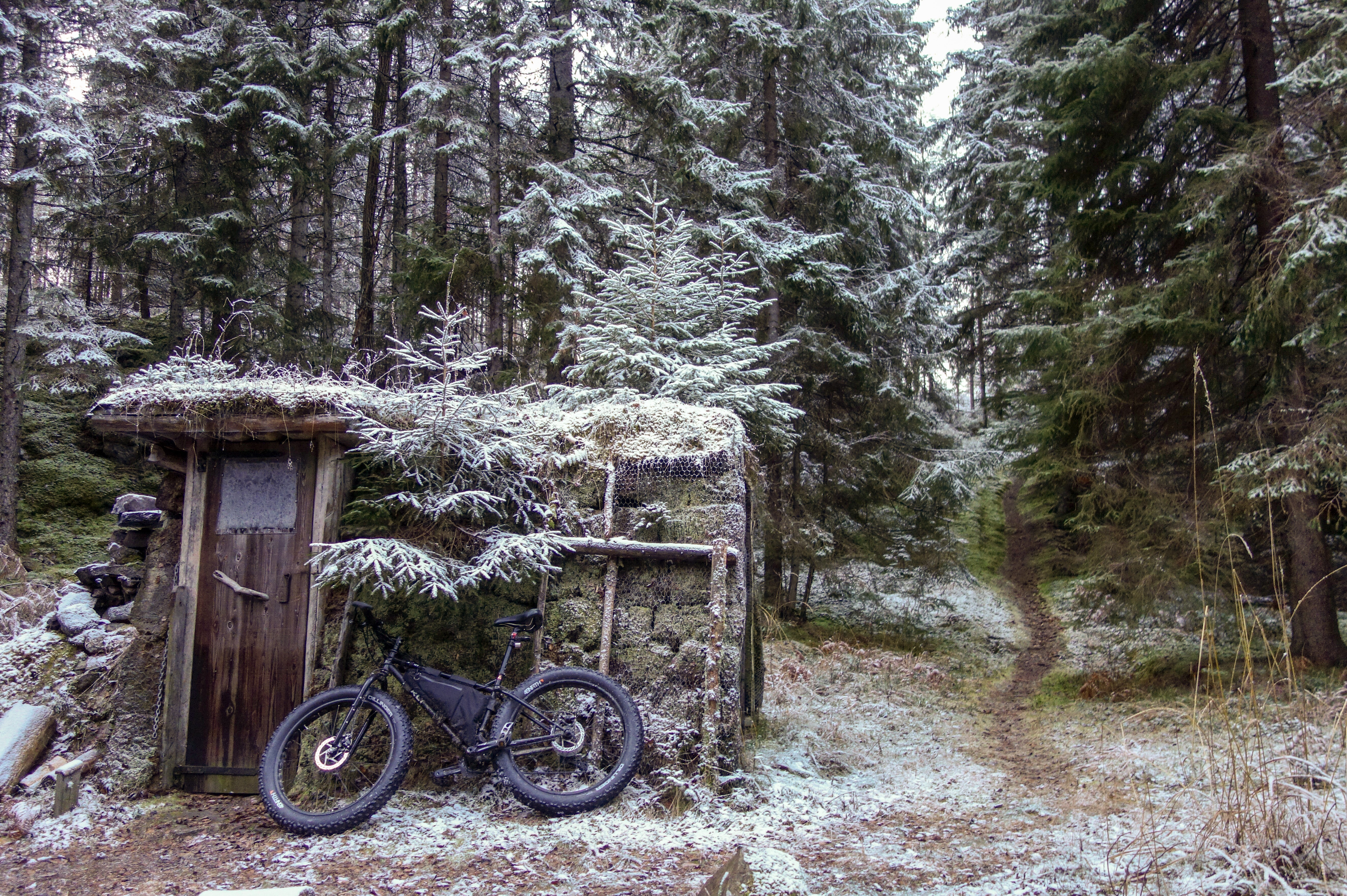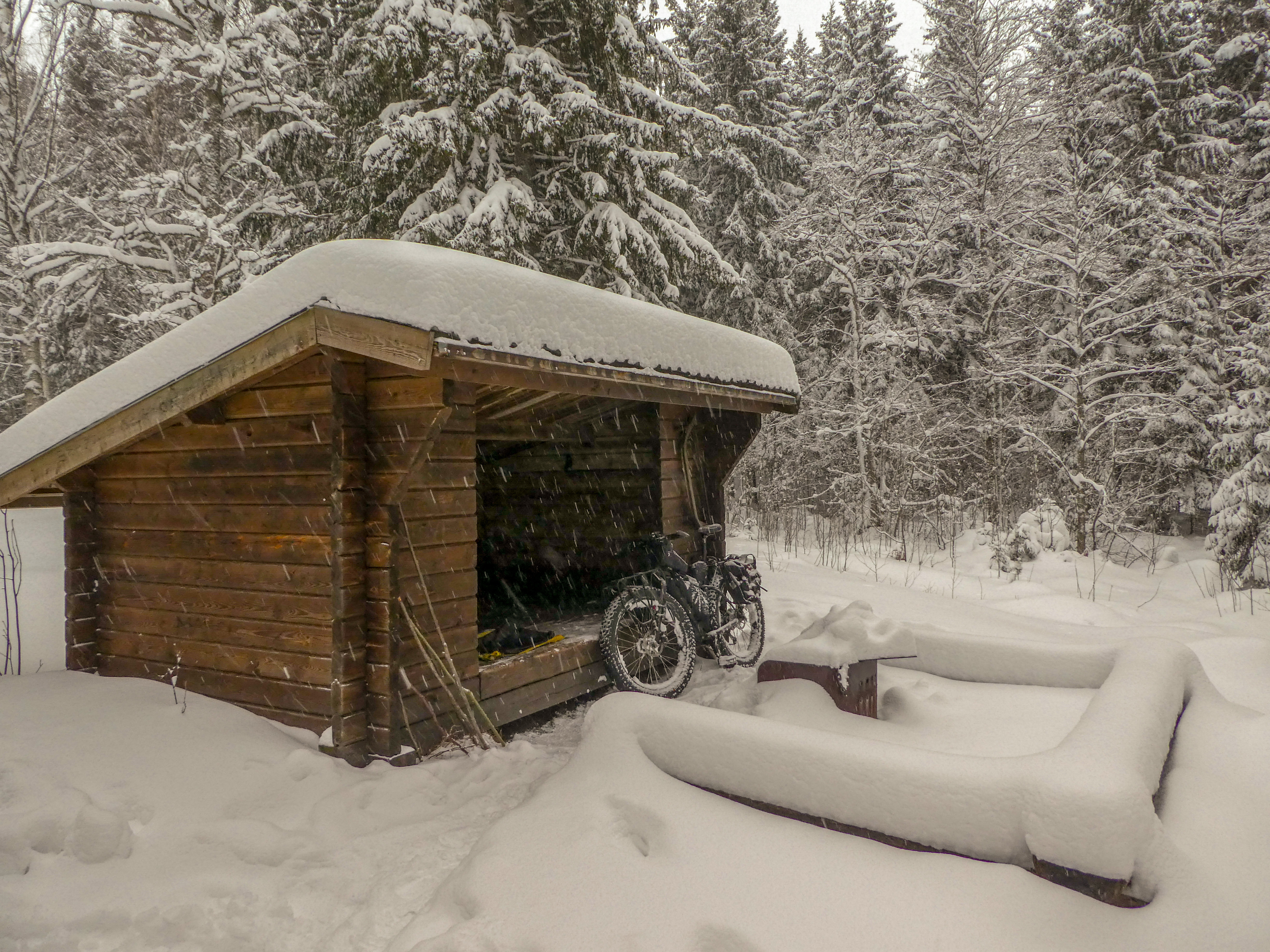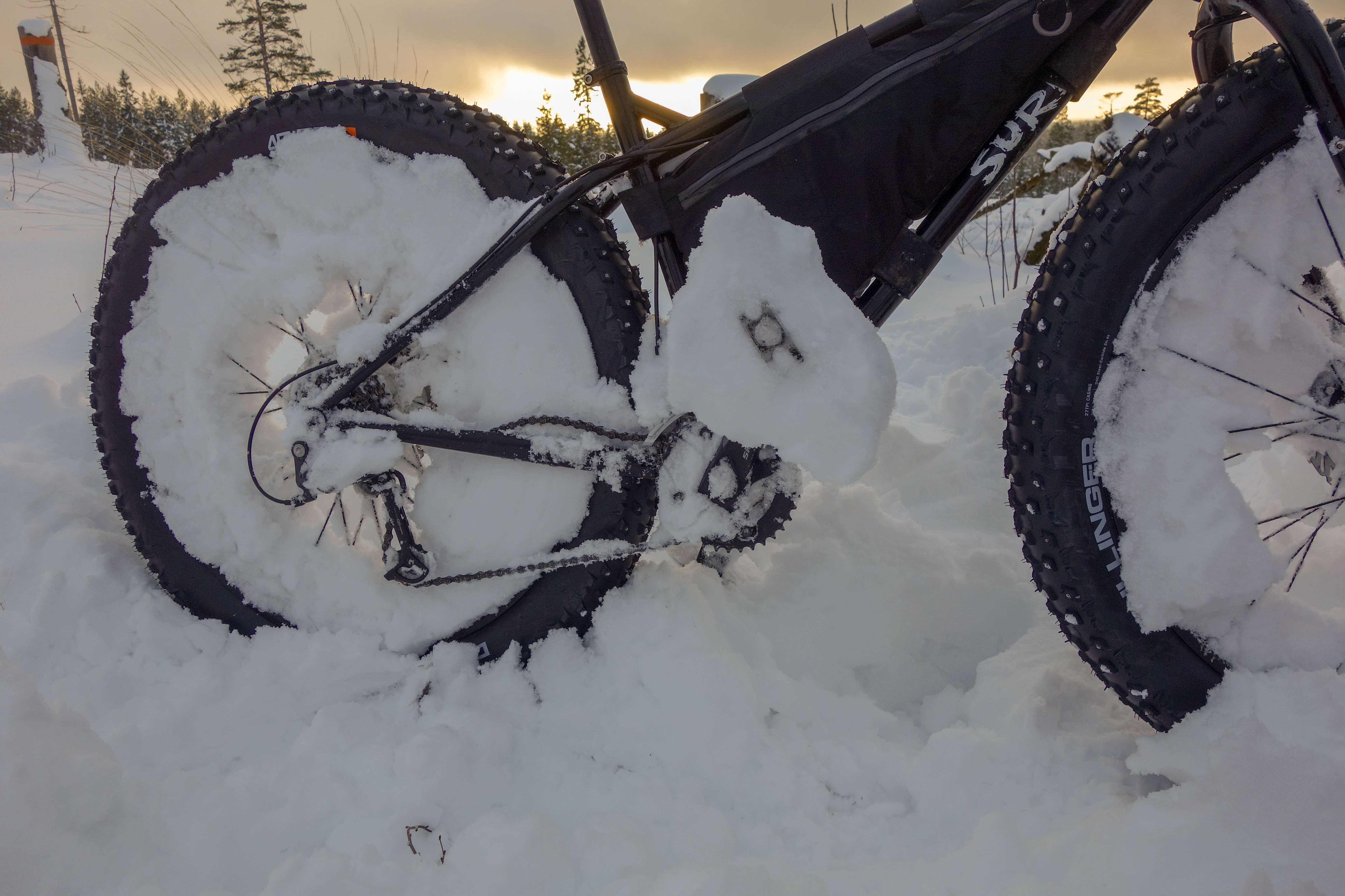 De fatbike slaapt meestal languit in de sneeuw naast de tipi. Een lange stok zoeken om hem te ondersteunen is een heel gedoe in diepe sneeuw, je wordt alleen maar koud en de sneeuw dringt in je laarzen, handschoenen, mouwen etc. Vaak zitten stokken ook vastgevroren in een dikke ijssneeuwlaag en tis zowiezo nog de vraag of het zou helpen want bij nieuwe sneeuwval verdwijnt de fiets toch.
