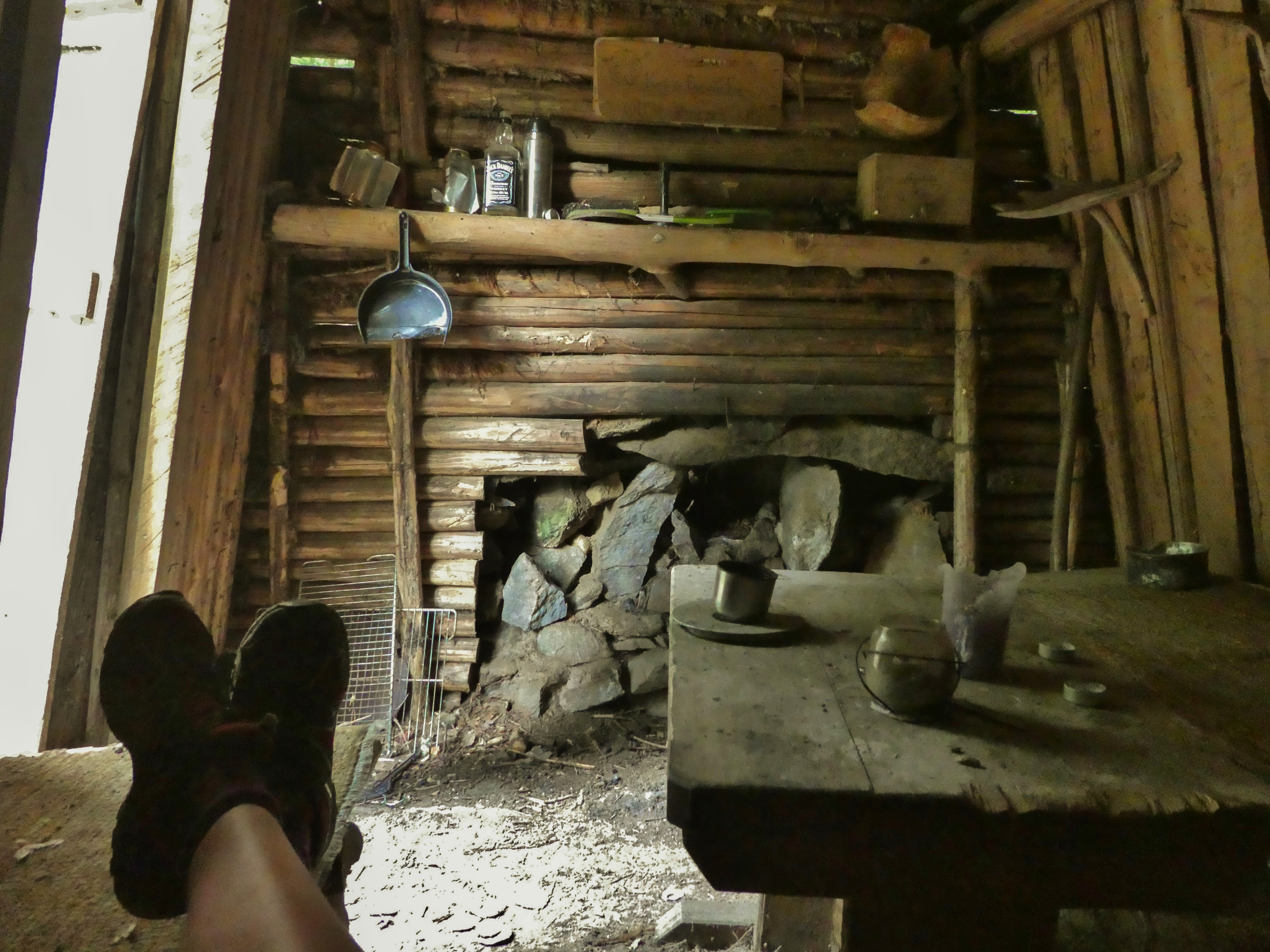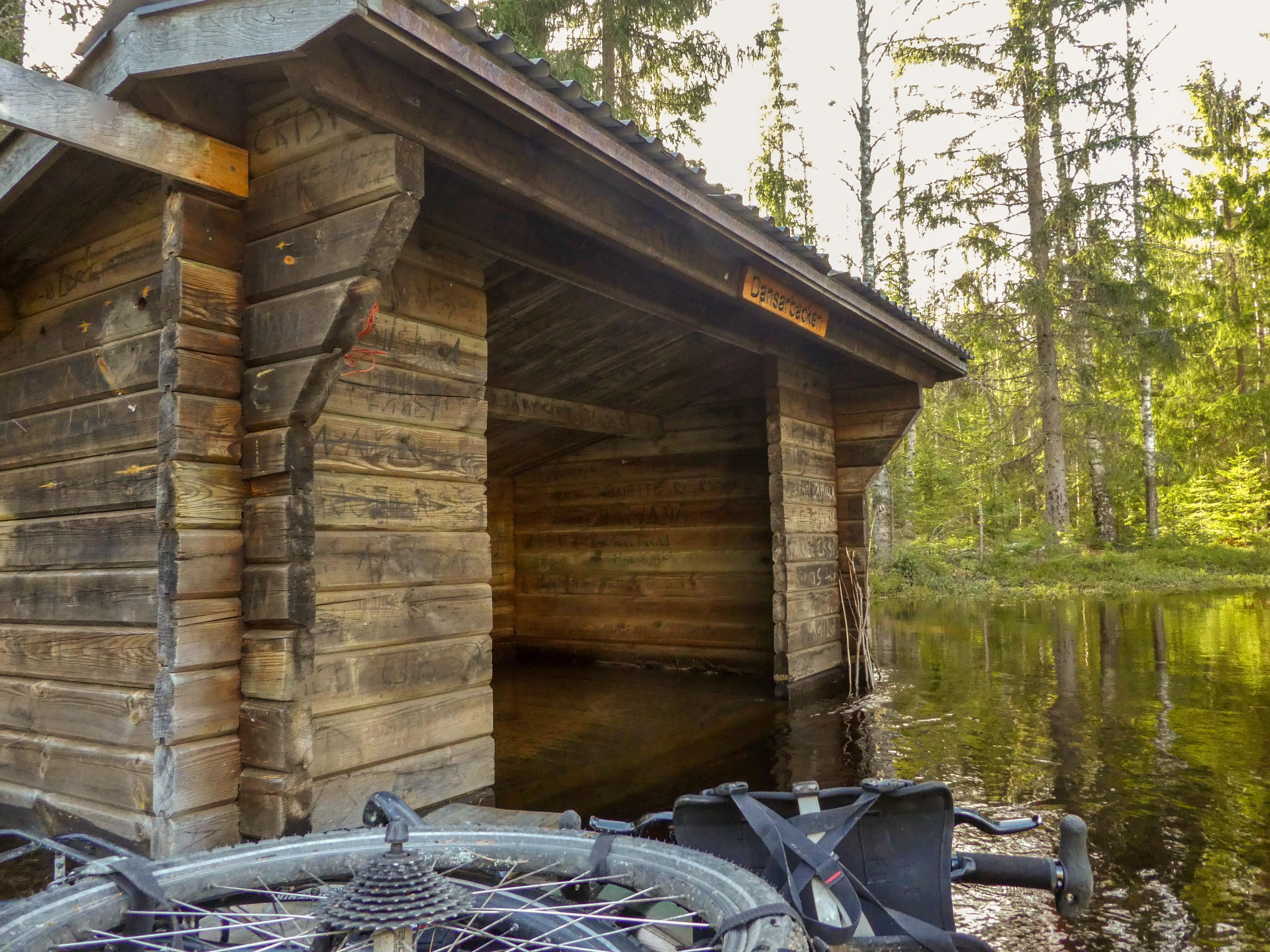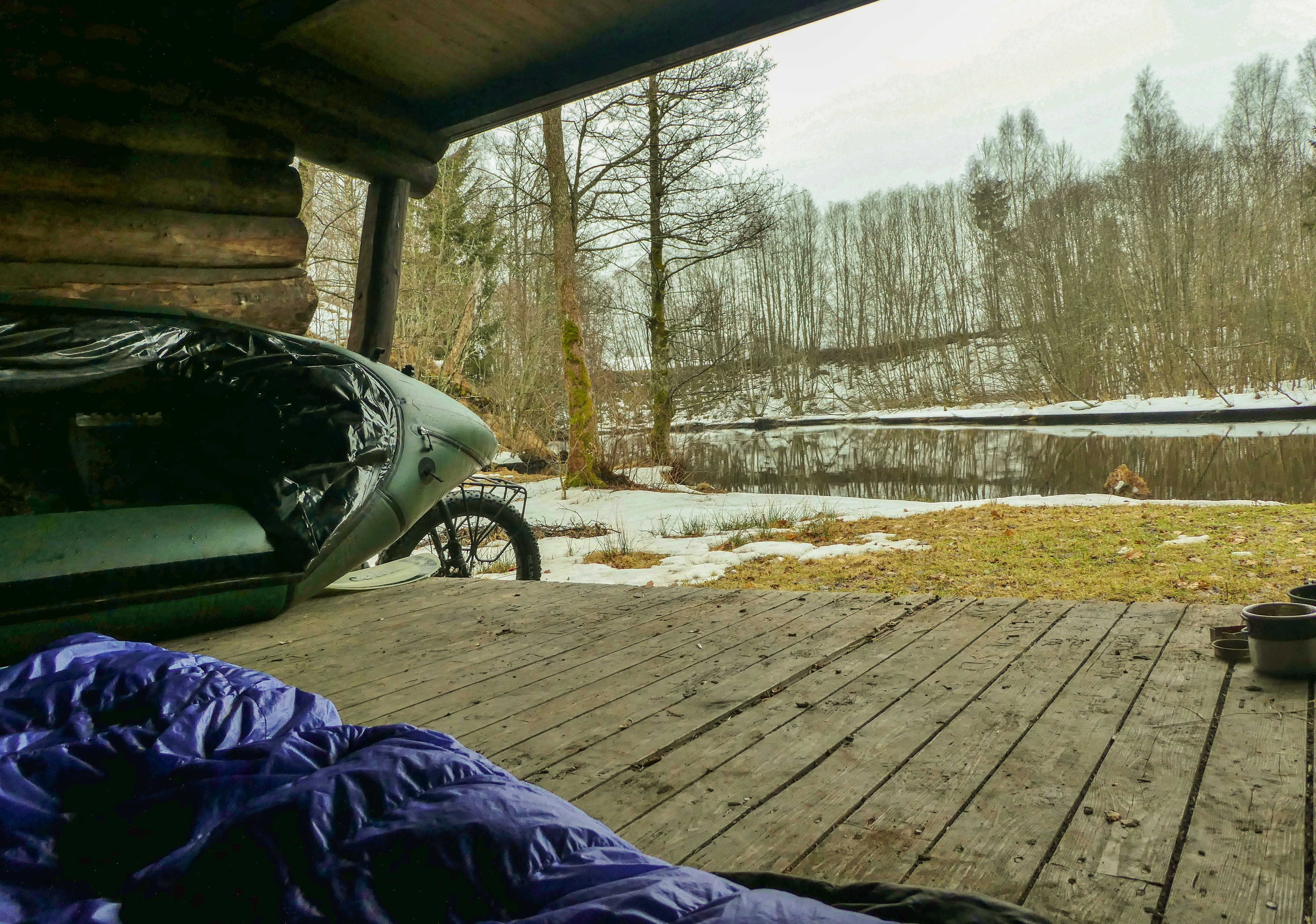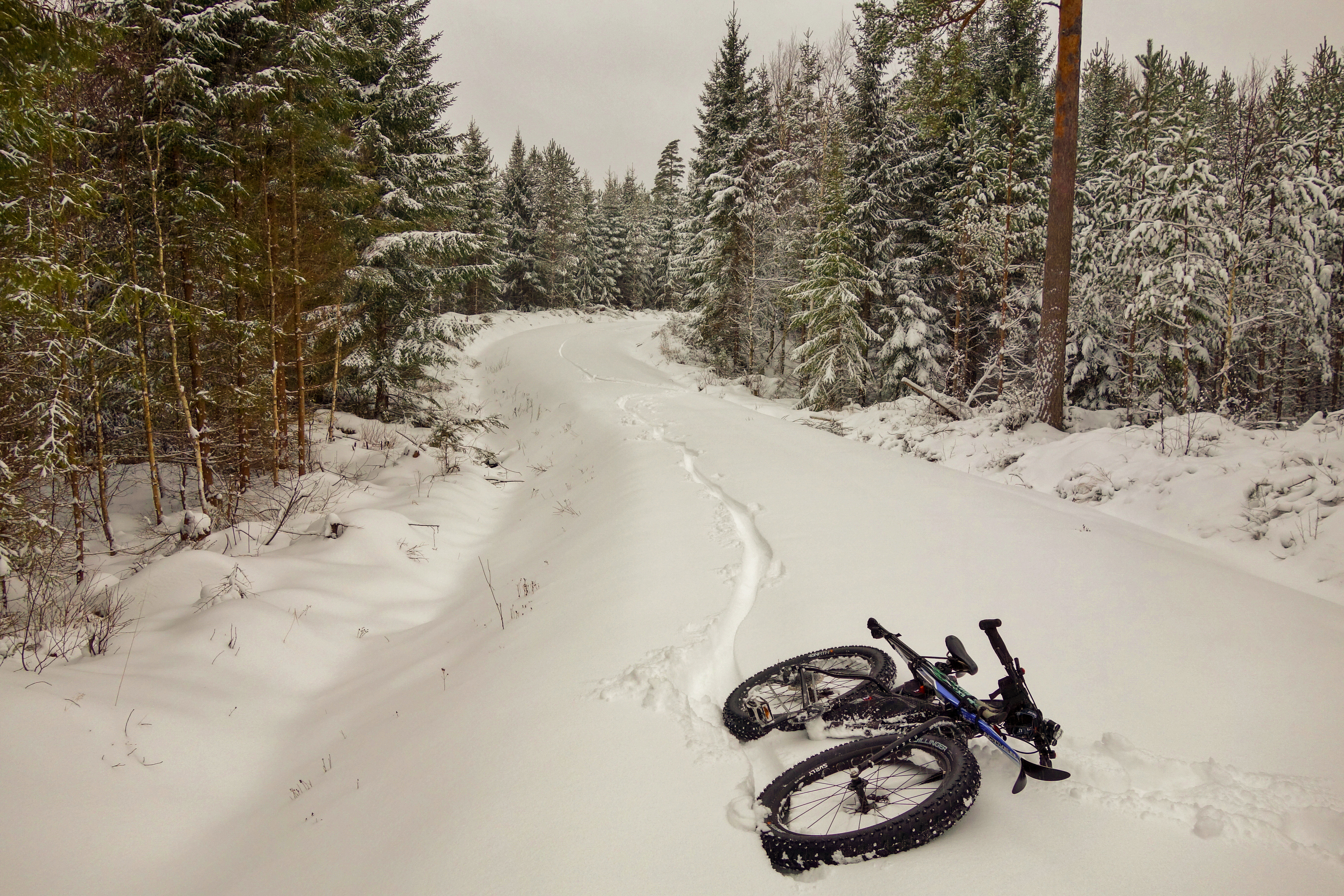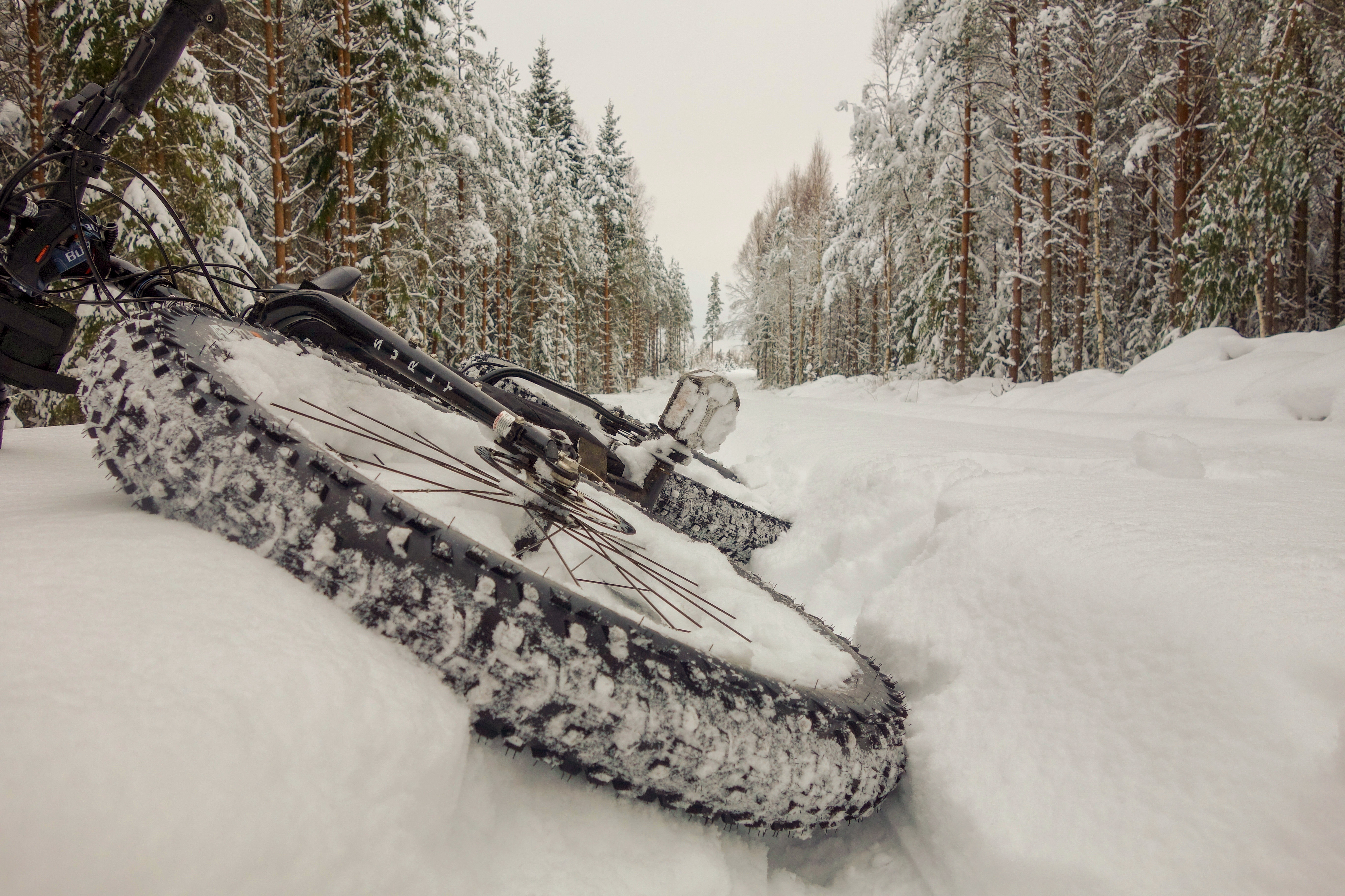 De fatbike slaapt meestal languit in de sneeuw naast de tipi. Een lange stok zoeken om hem te ondersteunen is een heel gedoe in diepe sneeuw, je wordt alleen maar koud en de sneeuw dringt in je laarzen, handschoenen, mouwen etc. Vaak zitten stokken ook vastgevroren in een dikke ijssneeuwlaag en tis zowiezo nog de vraag of het zou helpen want bij nieuwe sneeuwval verdwijnt de fiets toch.