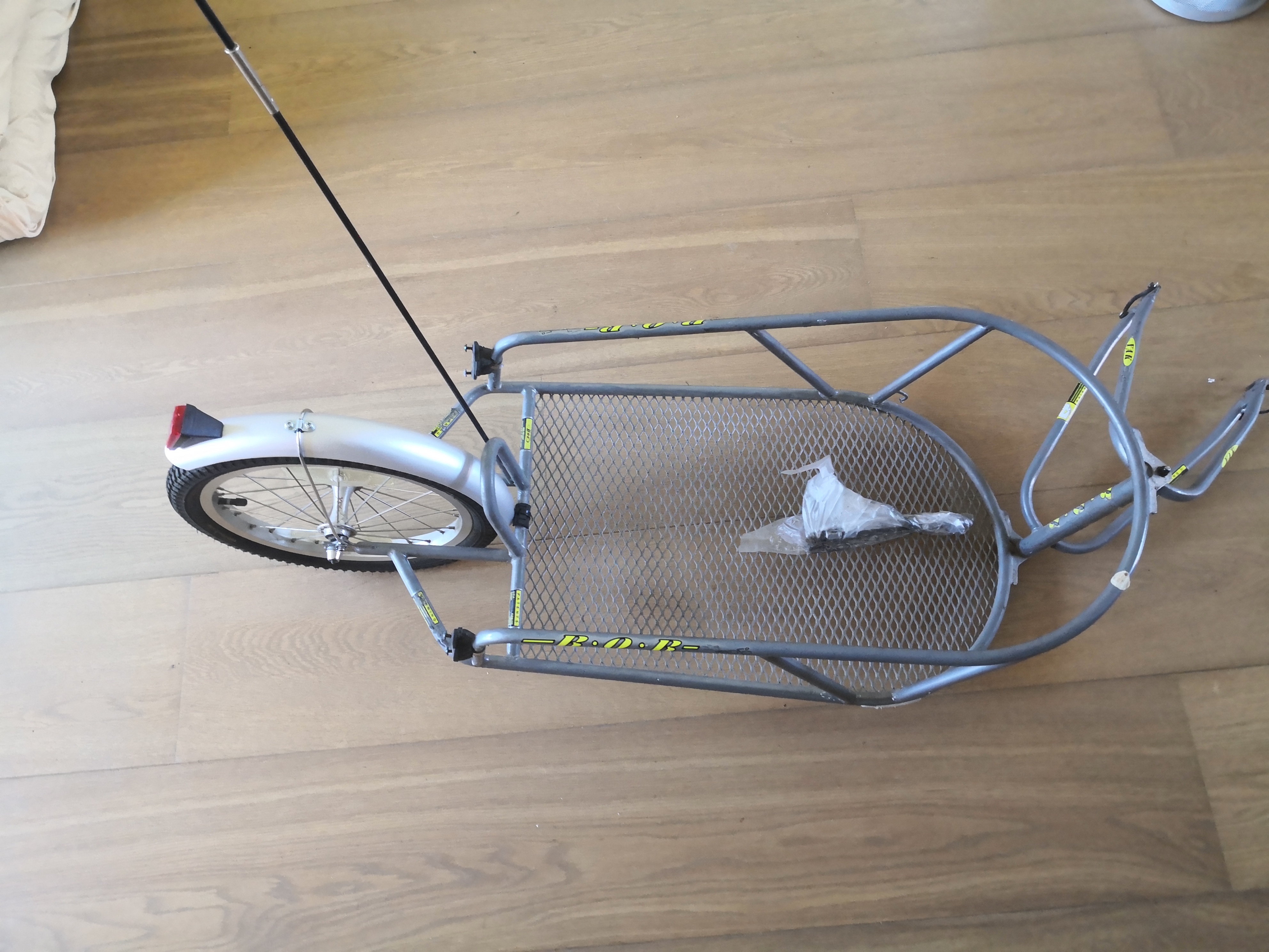 Ik heb recent een nieuwere Bob kunnen aanschaffen dus bij deze onze oude Bob Yak te koop. Weet niet precies hoe oud deze is, heb hem zelf ca. 5 jaar geleden 2e-hands aangeschaft. Betreft wel duidelijk een ouder model dan nu gangbaar is. De lugs voor bidonhouders zaten op dit model nog niet dus daar heb ik een andere oplossing voor gemonteerd, zie foto's.