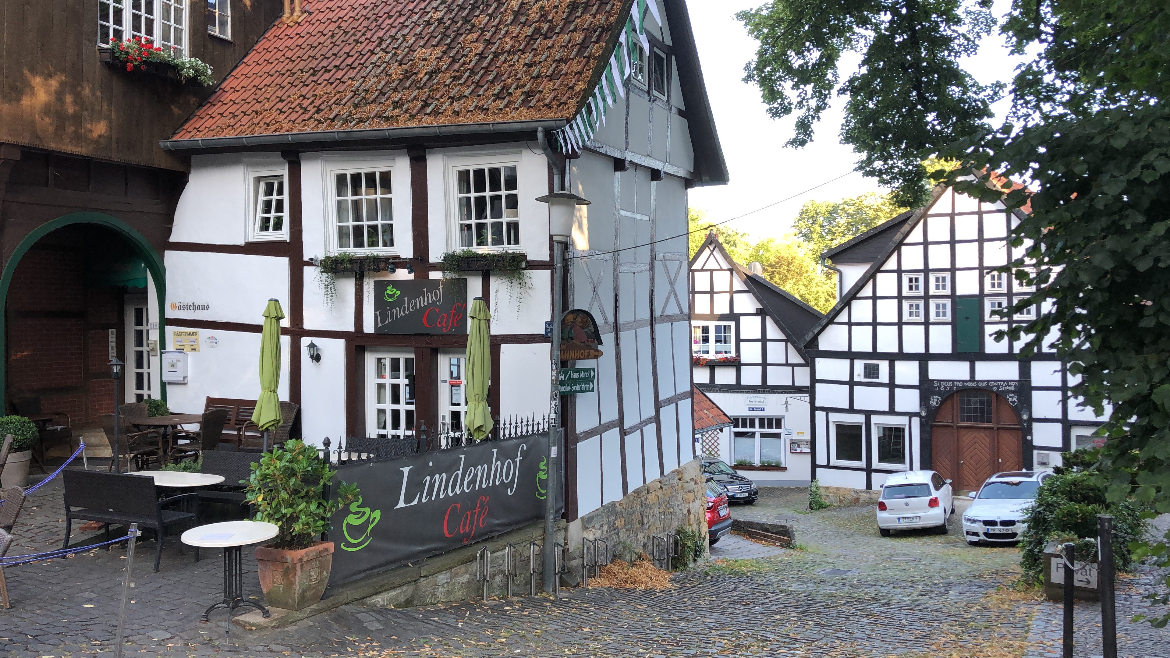 Vrijdag vroeg wakker, matig geslapen . Blijft wennen op je oude dag in slaapzak en luchtbed zonder echt kussen. Wordt warme dag, 33-34 graden en ik vertrek om 8:00 via de heuvels naar het zuiden. Na 10 km winkel/bakker waar ik broodjes en beleg insla, op mooie dorpsplein is het rustig en bij fontein ontbijt ik. Ik stap weer op de fiets en kan echt goed merken dat 2 of 4 tassen een enorm verschil is met gewicht en rij eigenschappen. Vandaag staan er 3 dingen op mijn todolist. Bad Rothenfelde staat een gebouw wat ik wil zien. Het Senne oefengebied en plaatsje Paderborn.
