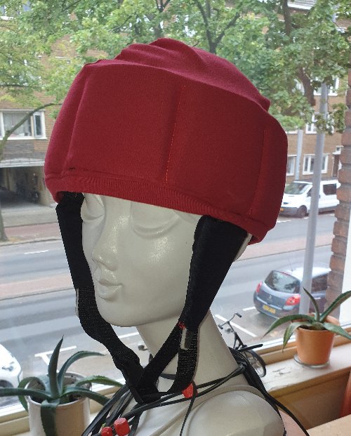 Vervolgens wil ik een hoofdband maken van een luchtiger materiaal, met pockets waar die schuimplastic banen in kunnen worden gestoken.