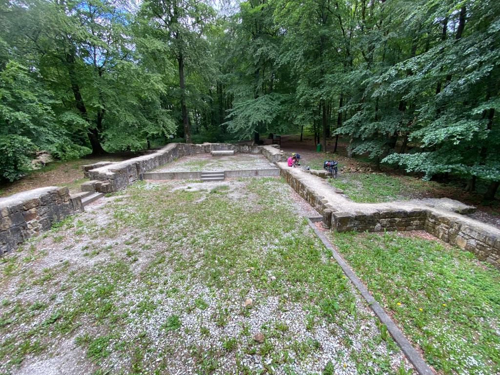 Via een ruïne van een oud klooster (Jostberg) een bospad met veel grint op weg naar Halle.