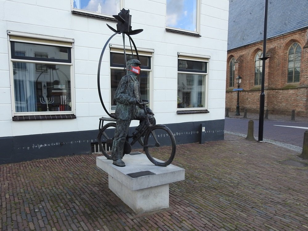 Anderzijds de fietser met een fiets van het model dat al honderd jaar bestaat, en niet met zijn tijd is meegegaan.