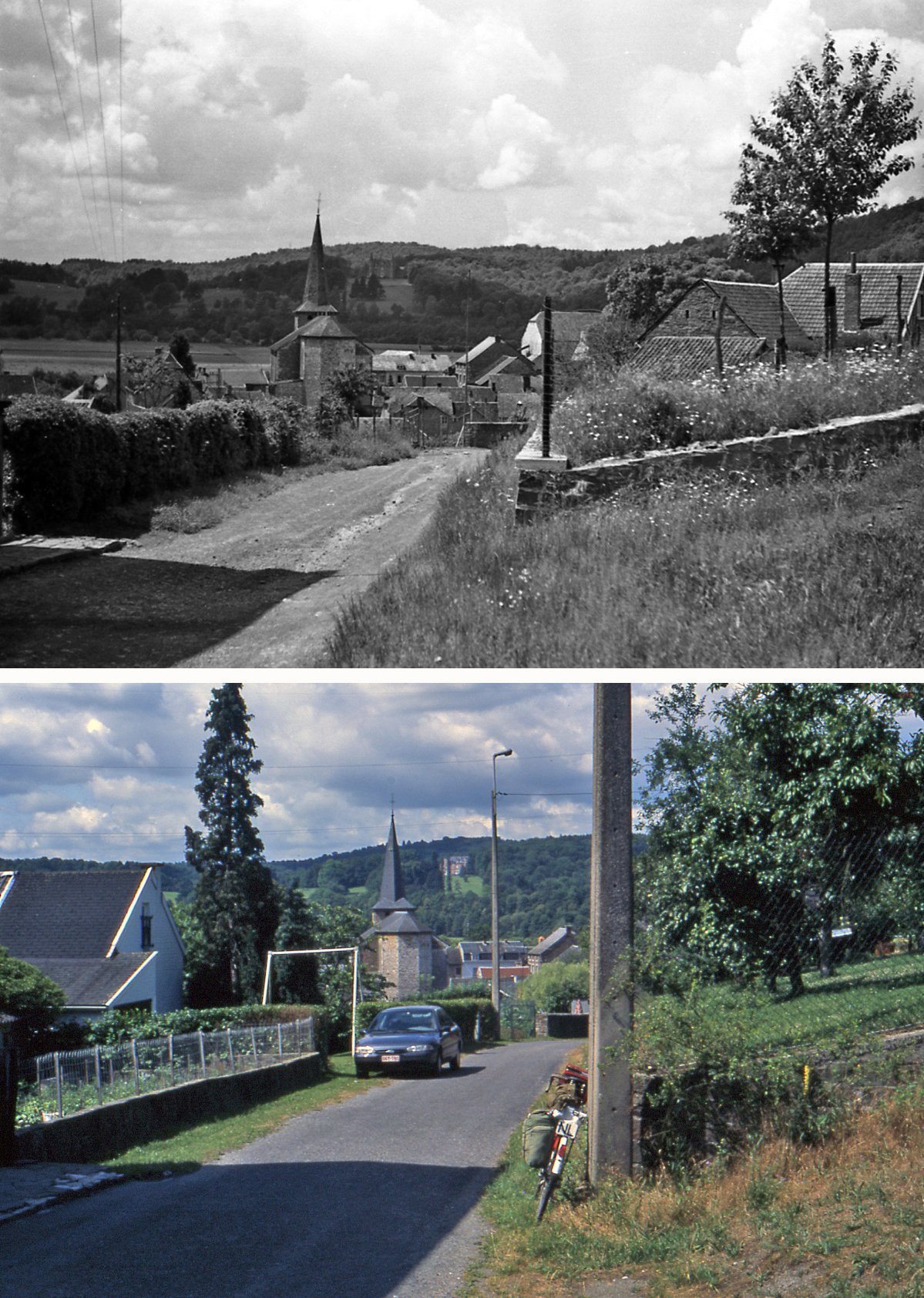 Mijn vader - ook op de fiets - heeft de zwart-wit foto in 1951 gemaakt. En 44 jaar later heb ik dezelfde plek gefotografeerd. Maar waar?