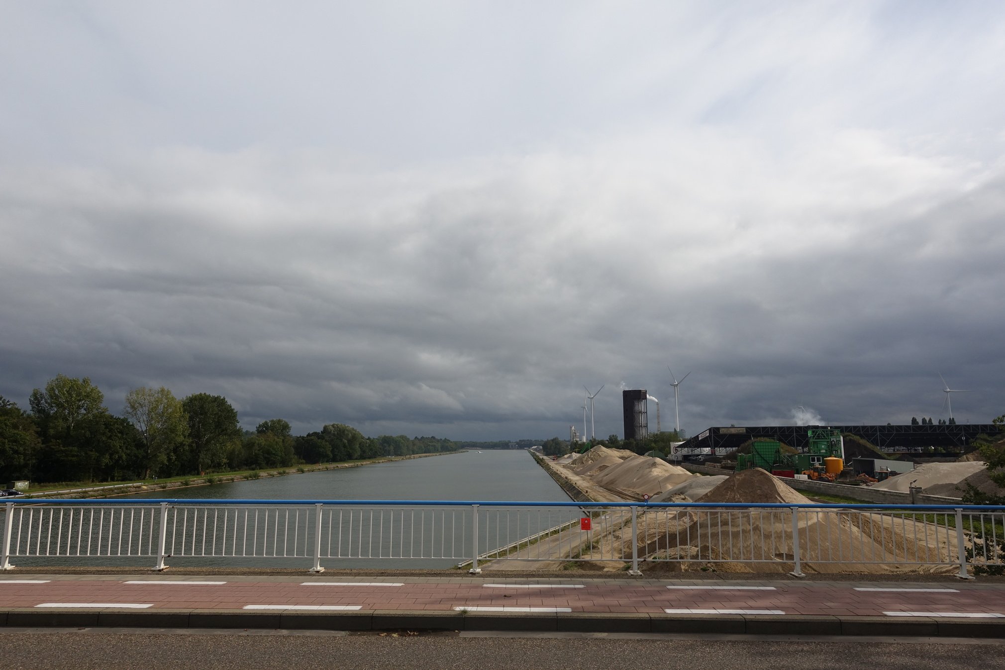 Albertkanaal droop er voor mij aan alle kanten af hoewel ik op deze plek nooit was geweest. De stevige bocht naar links op het verre eind en de zonnestand die aan de palen van de windturbines te zien is deed de rest.