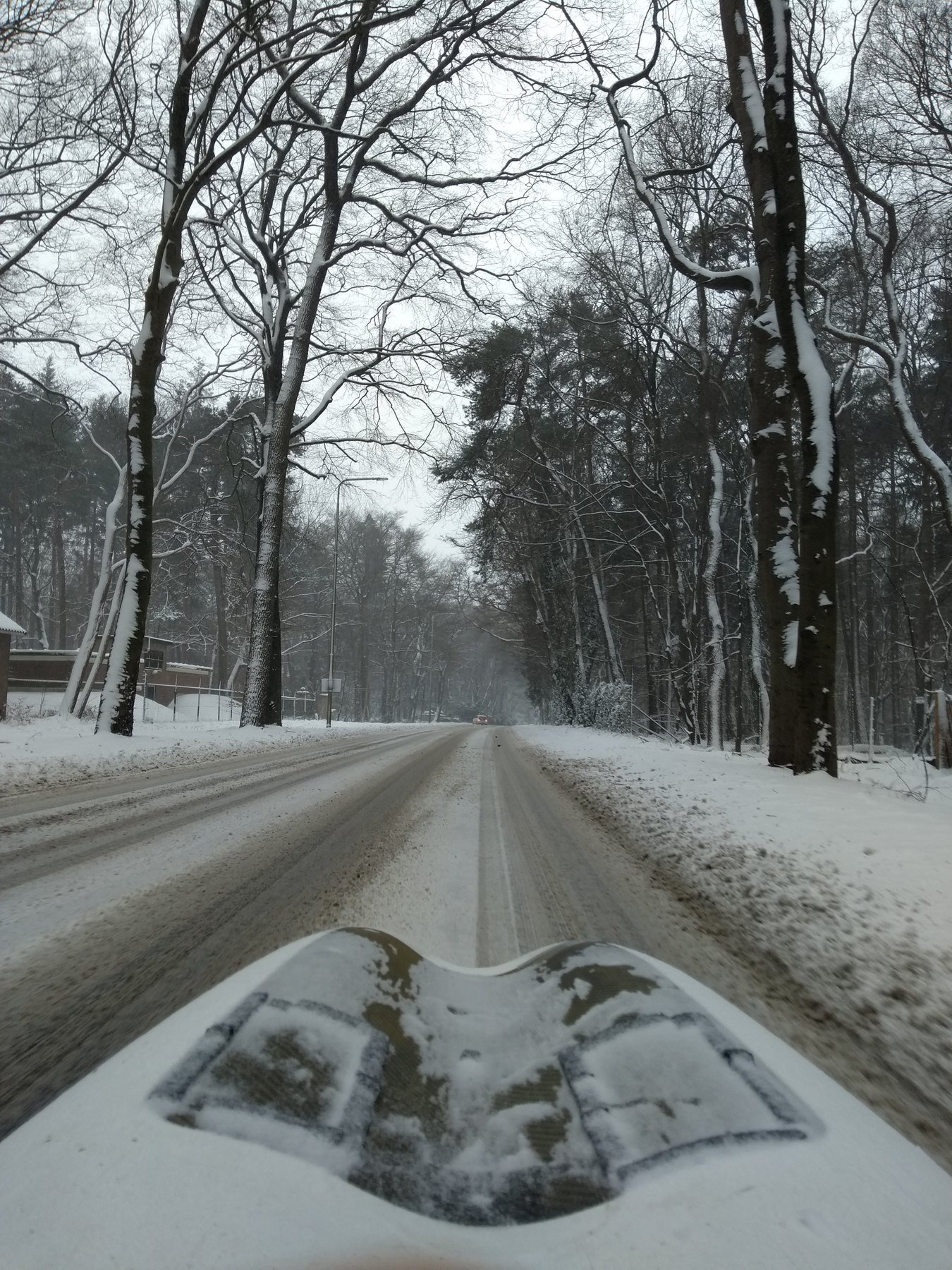 Disclaimer: Vanochtend in de net gevallen sneeuw was het nog niet glad, enkel mijn achterwiel schoof soms even weg in de diepere sneeuw. Als sneeuw aangekoekt is en het wat dooit, kan het glad worden. Met dit bericht wil ik niemand aanzetten tot waaghalzerijen in de sneeuw/op het ijs :) .