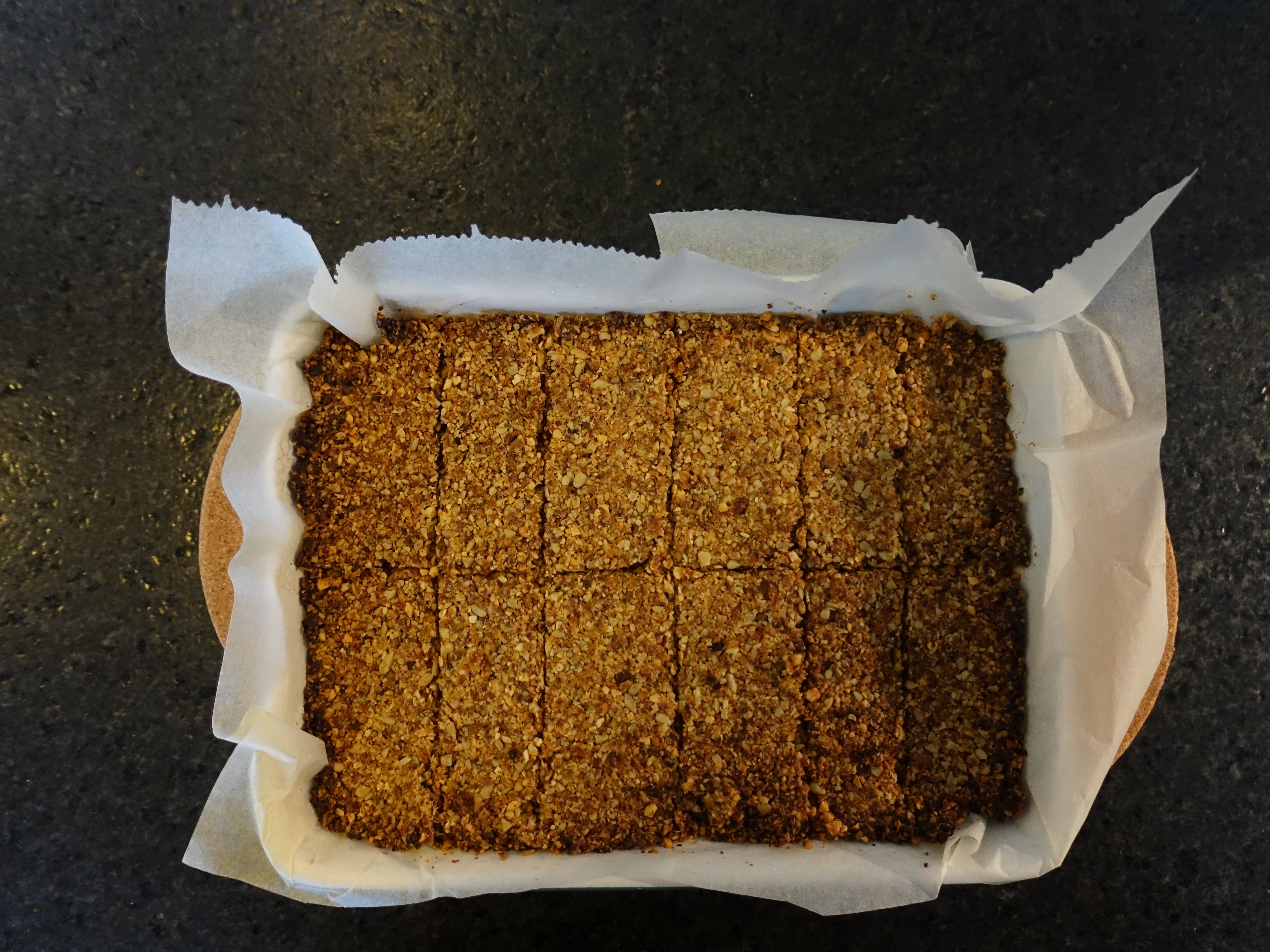 Haal de pan van het vuur en voeg sesamzaad, zonnebloempitten, amandelschilfers, rozijnen en gehakte dadels toe.