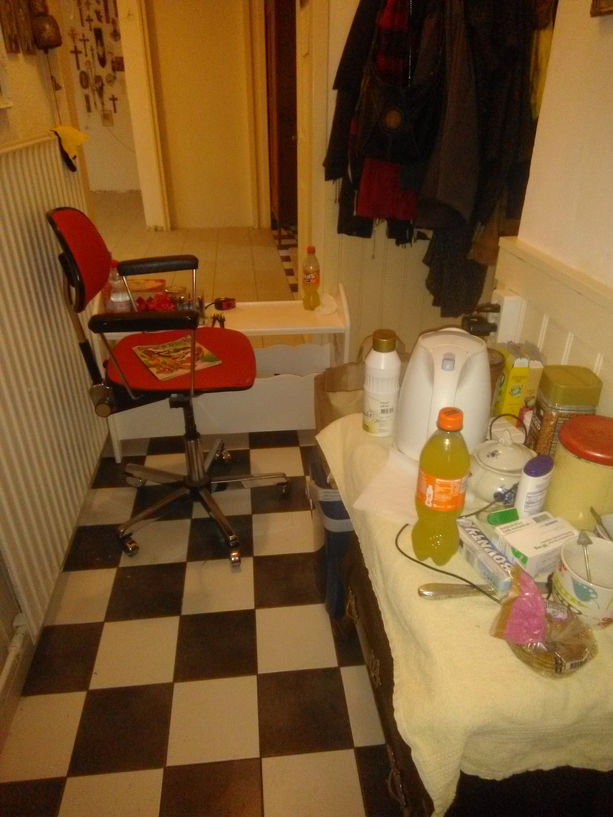 Ik had ook aan Nuth gedacht maar toen kwam de tegelzetter mij zeggen, die internetkabel staat in de weg, dus plop. Wij kamperen momenteel alleen nog in de gang en boven blijft de slaapkamer over die nog te koud is. Vanmiddag maar rondgetoerd met de auto. Nog te koud om te fietsen en het regent ook. Op de achtergrond de nieuwe tegelvloer, de komende 24 uur niet betreden.