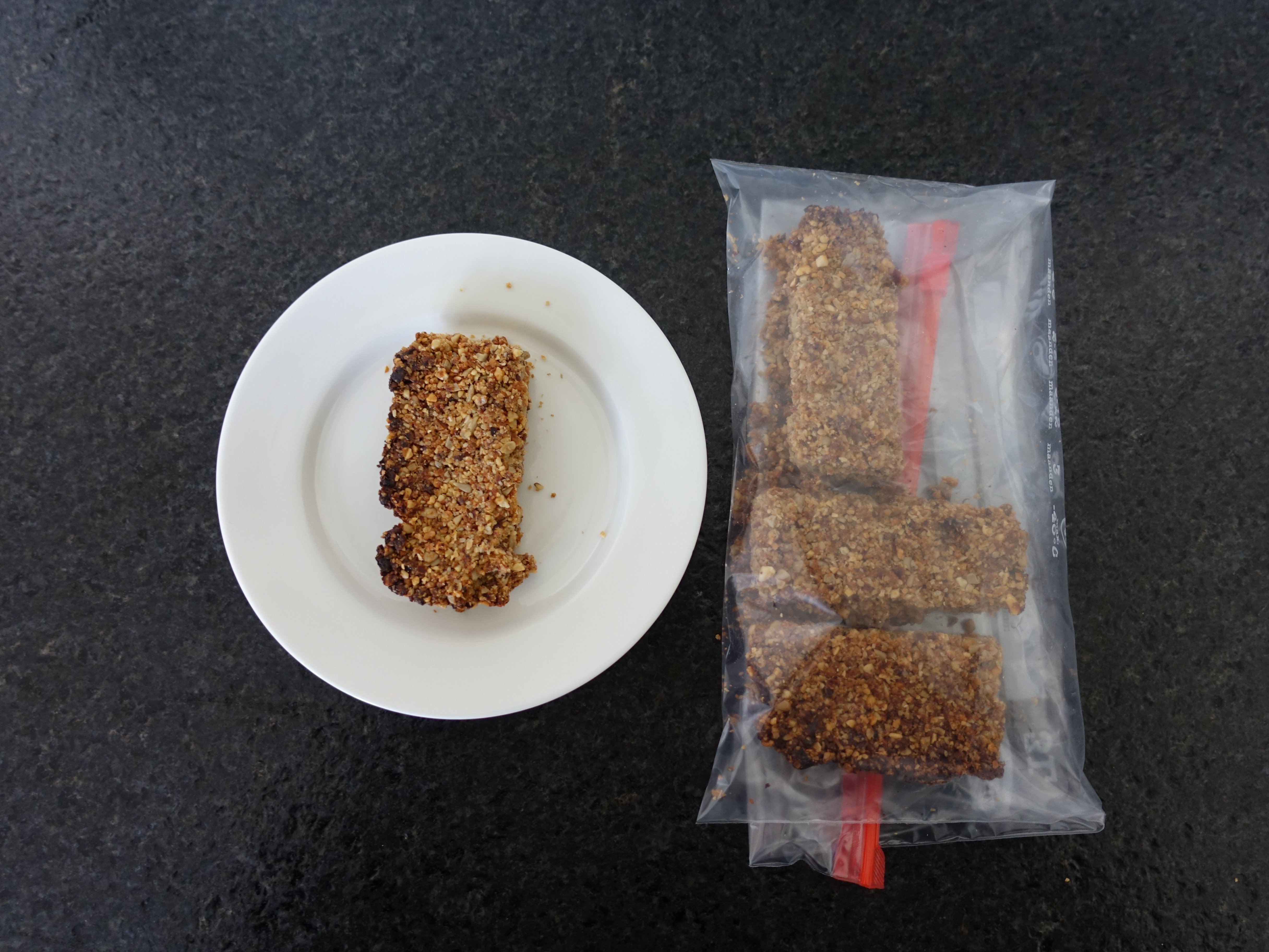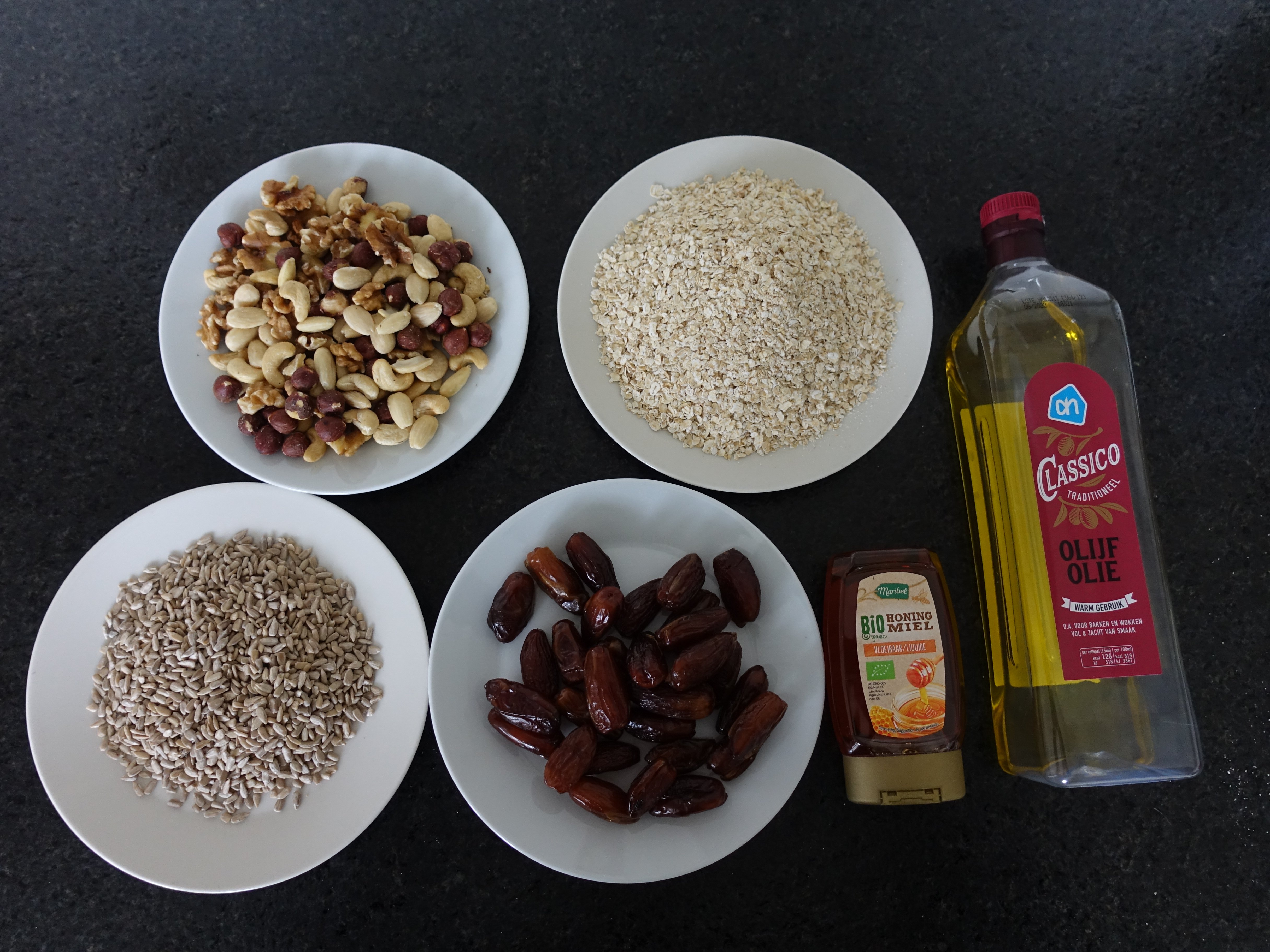 Haal de pan van het vuur en voeg sesamzaad, zonnebloempitten, amandelschilfers, rozijnen en gehakte dadels toe.