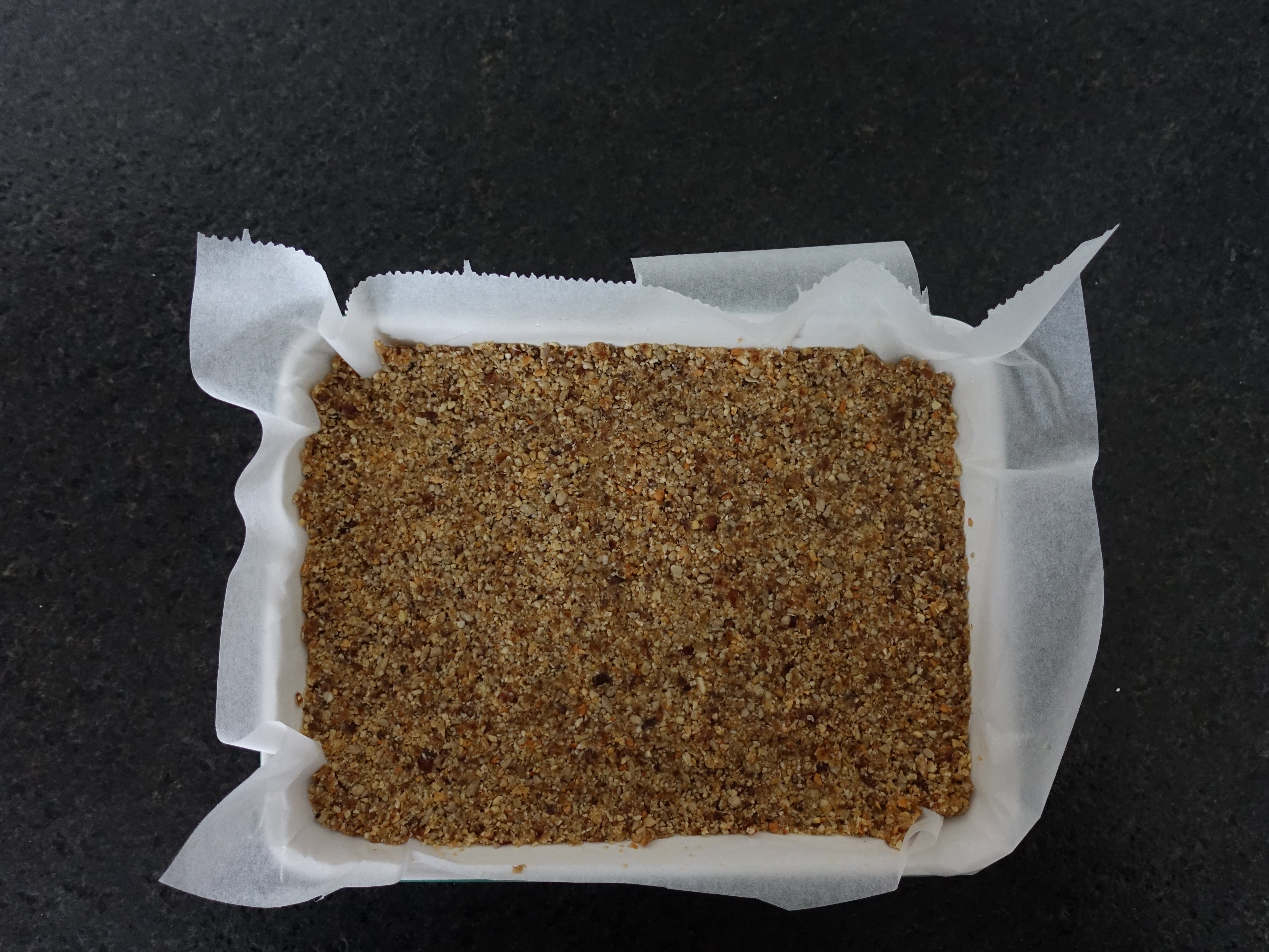 Bekleed een bakblik van ongeveer 25 op 15 cm of gelijkaardig met bakpapier en giet het mengsel in het bakblik.