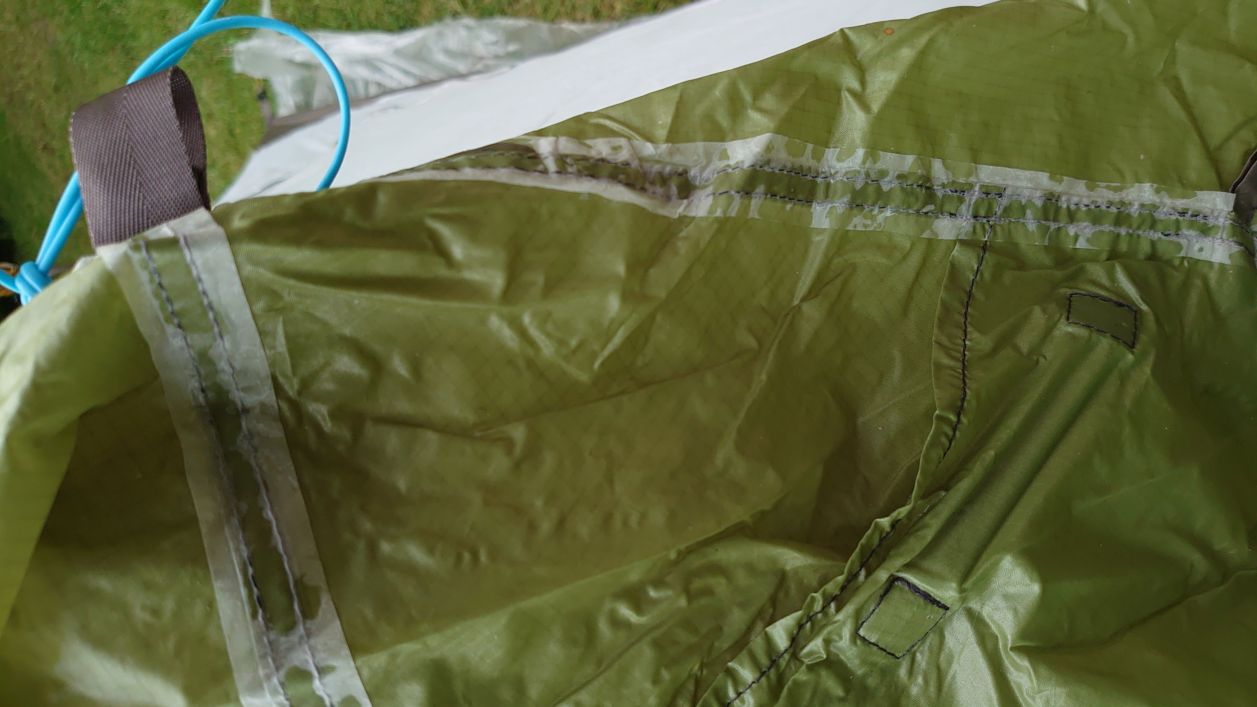 Vandaar het nieuwe grondplastic van de Gamma. (die van de Bauhaus is of te dun of veel te dik) Daarnaast hangt mijn tent door en is lek. Als ik niets doe raakt de buitentent de binnentent. (zie foto) Op bovenstaande foto zie je de loslatende plakband op de naden en ook de redding tegen het doorhangen.