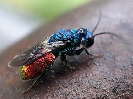 Ik ben jullie nu ook een natuurfoto schuldig. Een goudwespje uit de tuin.