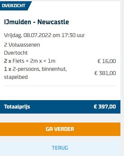 We willen met twee personen en twee fietsen van Ijmuiden naar Newcastle (dit in één hut).