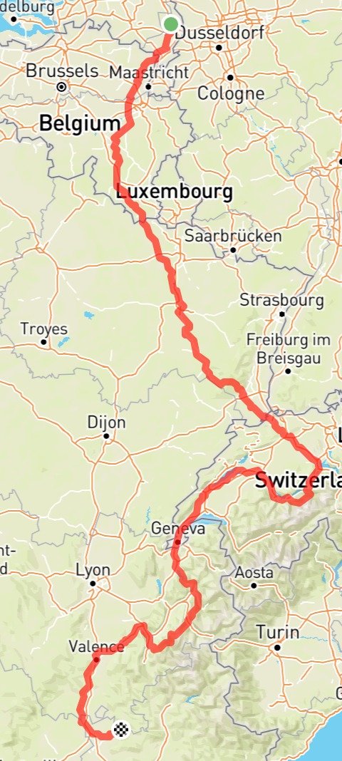 Aangezien ik met wat vrienden op vakantie ga in het zuiden van wallonie (nabij dinant) lijkt het me een goed idee om vanuit daar te vertrekken zodat ik het eerste deel door NL/DU/BE kan overslaan, dat kan ik inmiddels wel. Ik ben op zoek naar inspiratie voor routes die naar de Ventoux leiden, volgenden heb ik gevonden: