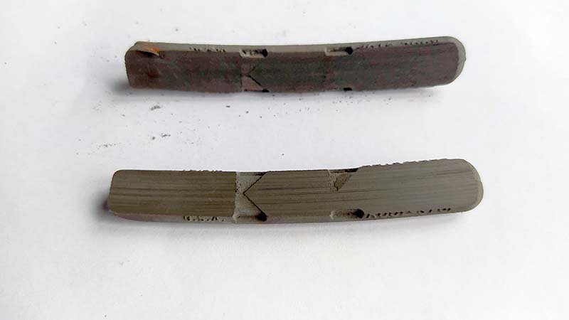 Op hun cantiblokjes staat wel een "wear line". (foto) Op de andere niet.