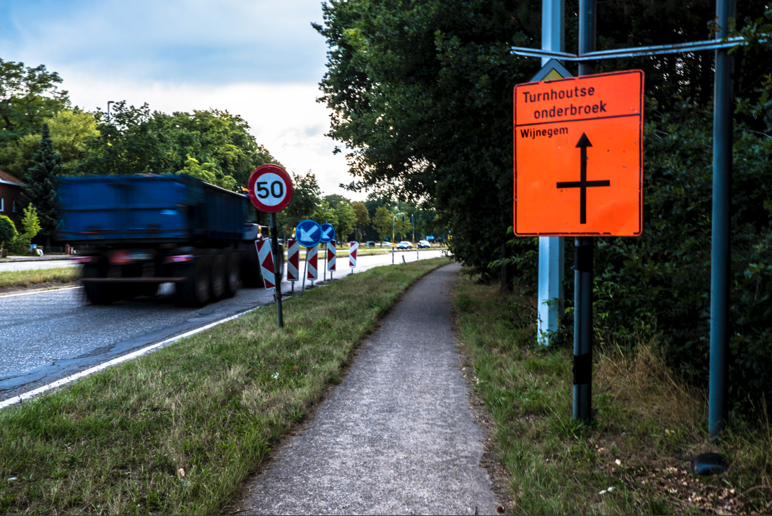 Deze week langs gereden: aankondiging van onderbroken weg (Turnhoutse baan) wegens heraanleg fietspad.