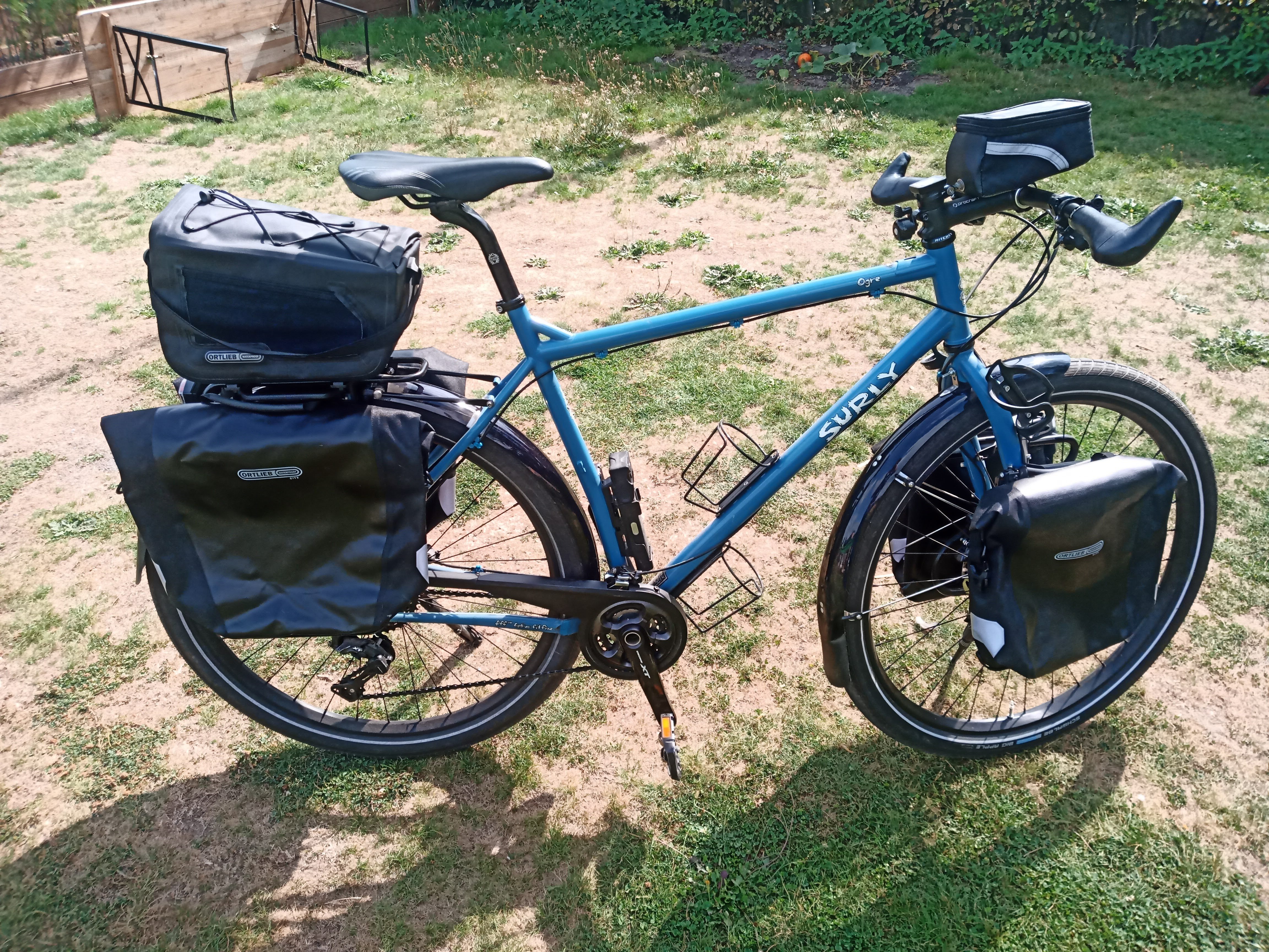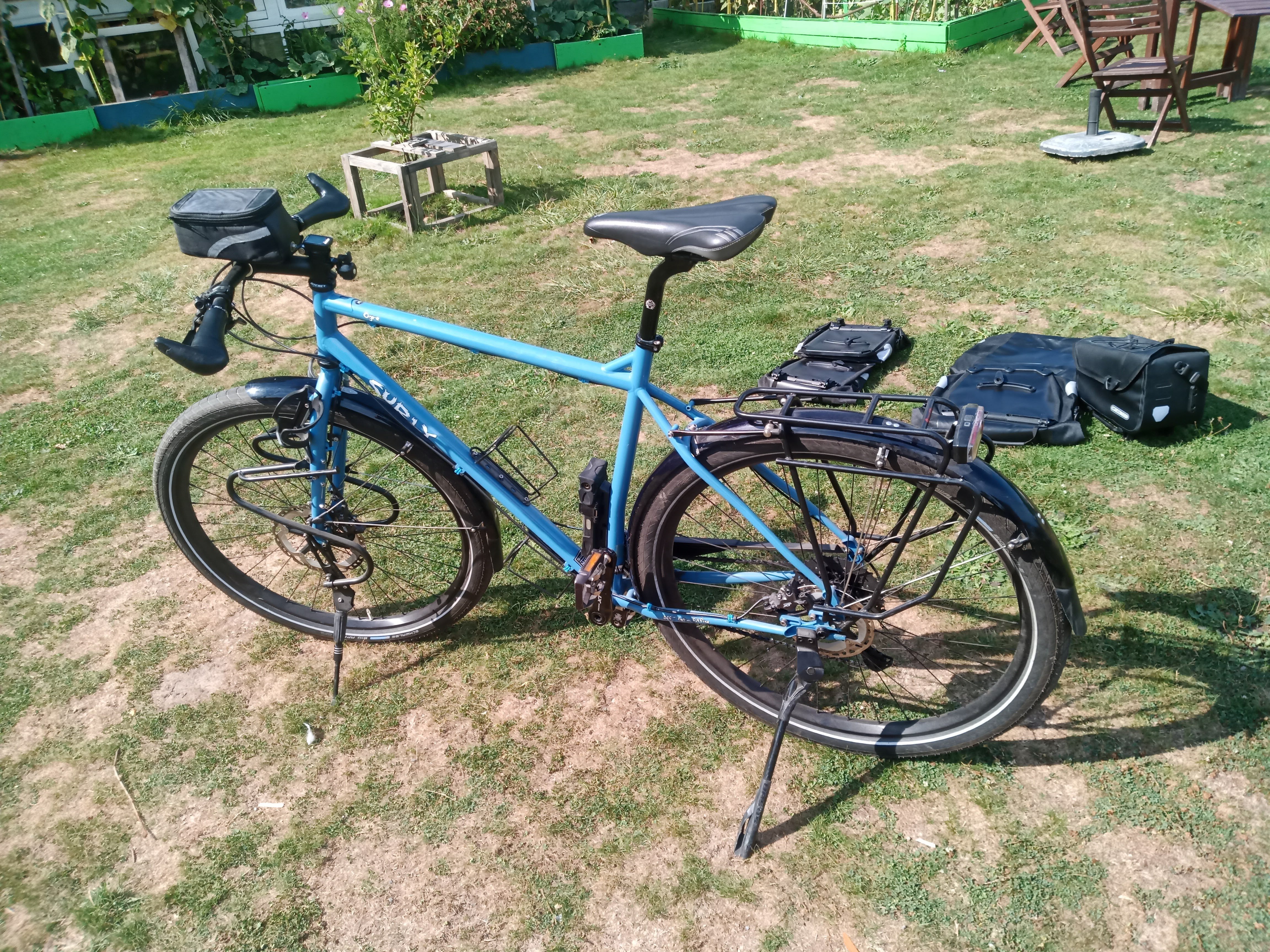 bagagedragers van tubus, zakken van orlieb. als je wil gaan reizen met de fiets en als je tussen 1.80M en 2M bent zou dit wel eens je droomfiets kunnen zijn, deze kwaliteit en details van de montage kan je voor zover ik weet niet in een winkel vinden....