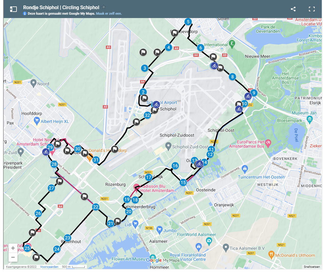 Een rondje Schiphol, een avontuurlijke fietstocht. Circa 32 km (verkort) of 42 km zonder een shortcut te nemen.