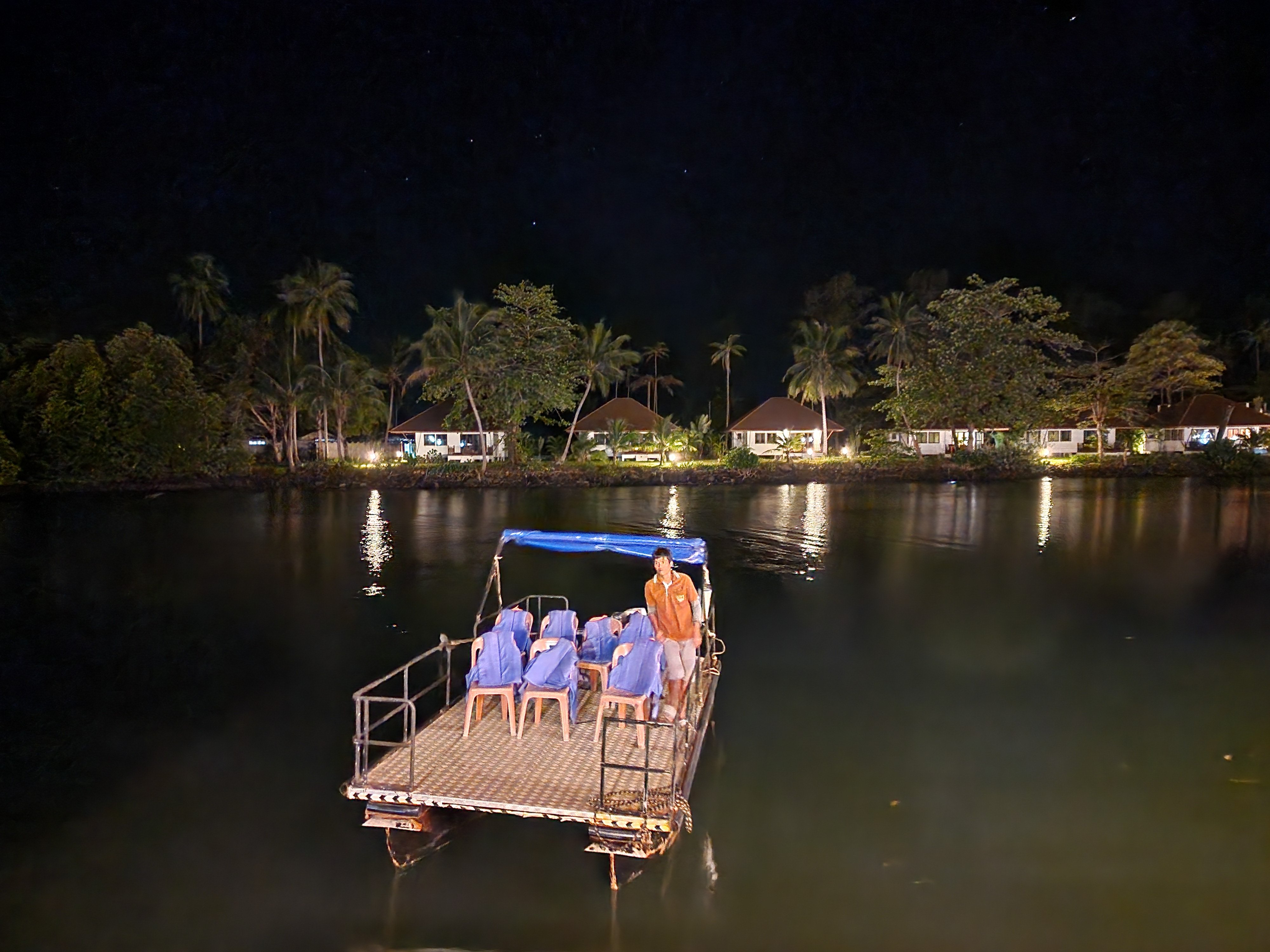 Met een voldaan gevoel geniet ik ’s avonds op het terras van mijn bungalow van het avondzonnetje, net zoals enkele gekko’s op het glasraam boven me. Natuurlijk pik ik ook tijdig de zonsondergang mee op het strand. Bij het vallen van de duisternis boek ik in één van de vele reiskantoortjes in de straat een vuurvliegjes-privé-tour voor amper 250 Baht (6.75 EUR). Voor die prijs krijg ik een 10-km privé taxi rit (heen en terug) in een onverwacht sportieve rijstijl, een privé vlot met bestuurder, een rondvaart in de pikdonkere mangrove, en een negental vuurvliegjes. Het is duidelijk dat het topseizoen van de vuurvliegjes elders in het jaar ligt. Ik vind het niet zo erg want de hele belevenis is leuker dan die paar kevertjes (die ik toch al eerder had gezien op verschillende andere plaatsen). Wat vooral indruk maakt, is opnieuw die mooie sterrenhemel. Bij het boeken van de tour hoopte ik de vuurvliegjes te kunnen vastleggen in ware National Geographic stijl, met lange sluiterstijden of multiple exposure en zo. Op het wiebelvlot komt daar uiteraard niks van in huis – het wordt niet beter dan enkele schokkerige witte lijntjes op een zwarte achtergrond. Ik laat de ultieme vuurvliegfoto nog even op mijn bucketlist staan.
