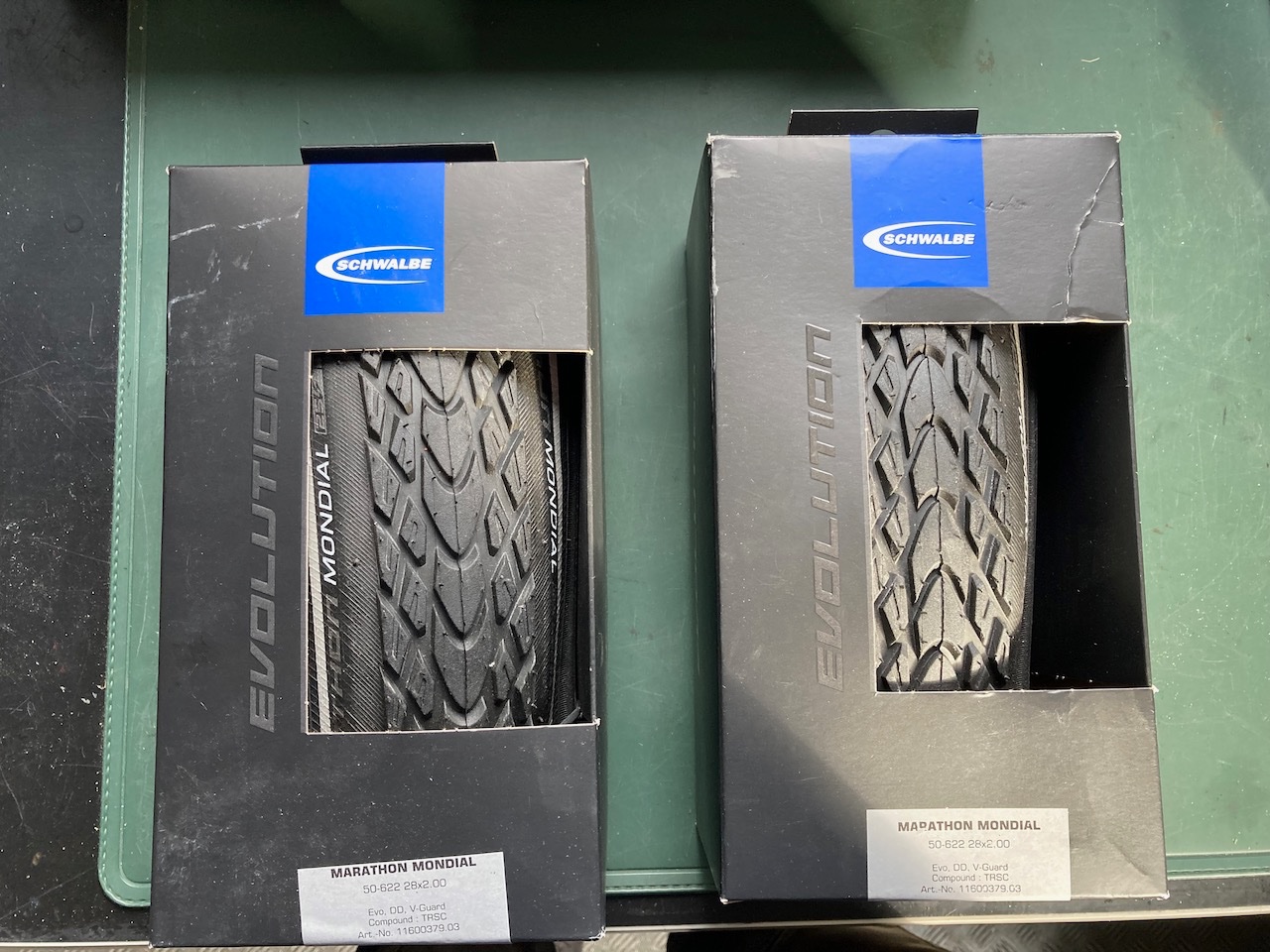 Een paar nieuwe Schwalbe Marathon Mondial Evo 28 x 2.0.