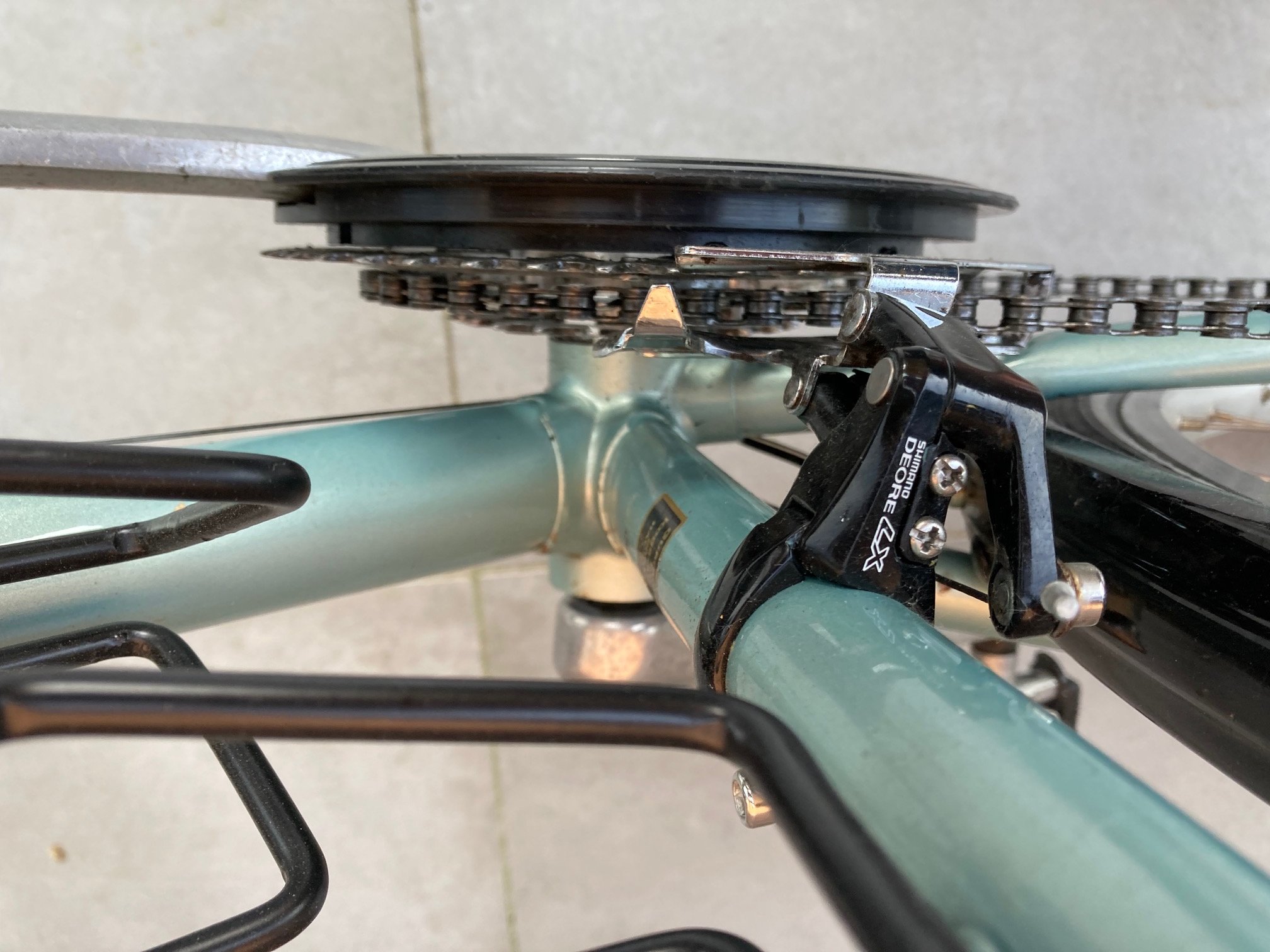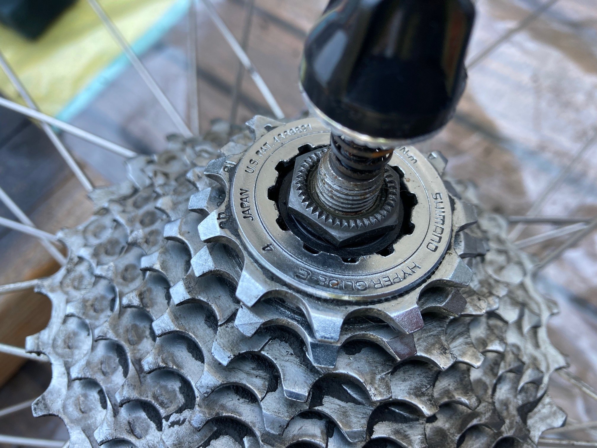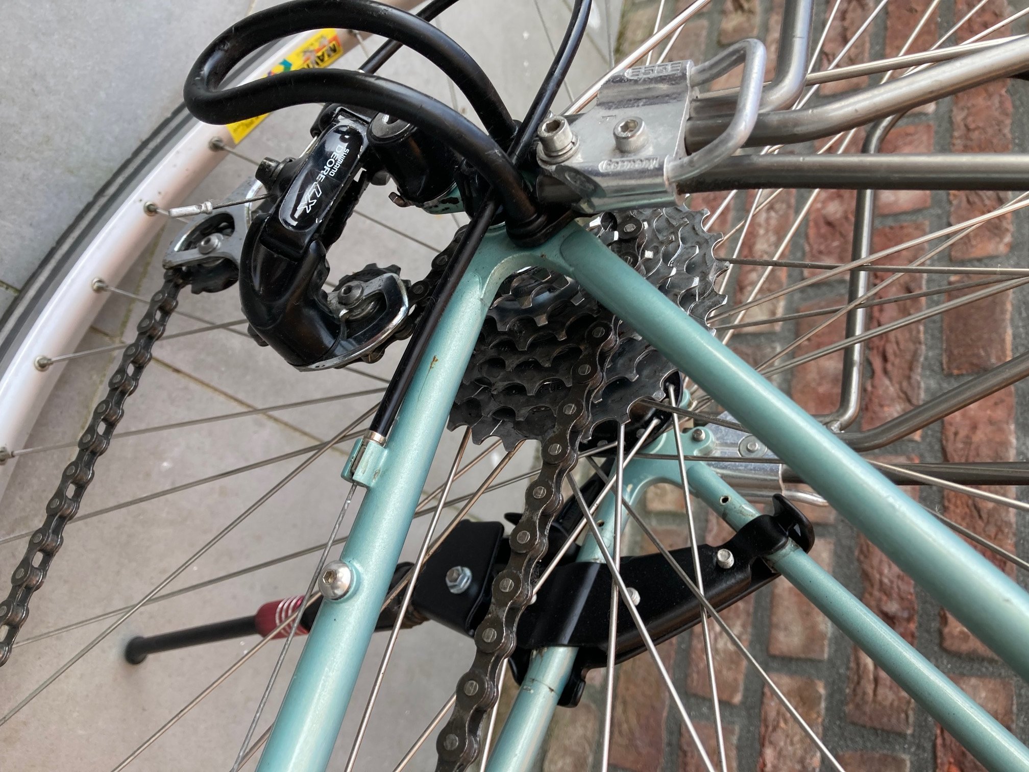 De cassette die er momenteel op zit is van het type Simano Hyperglide-C