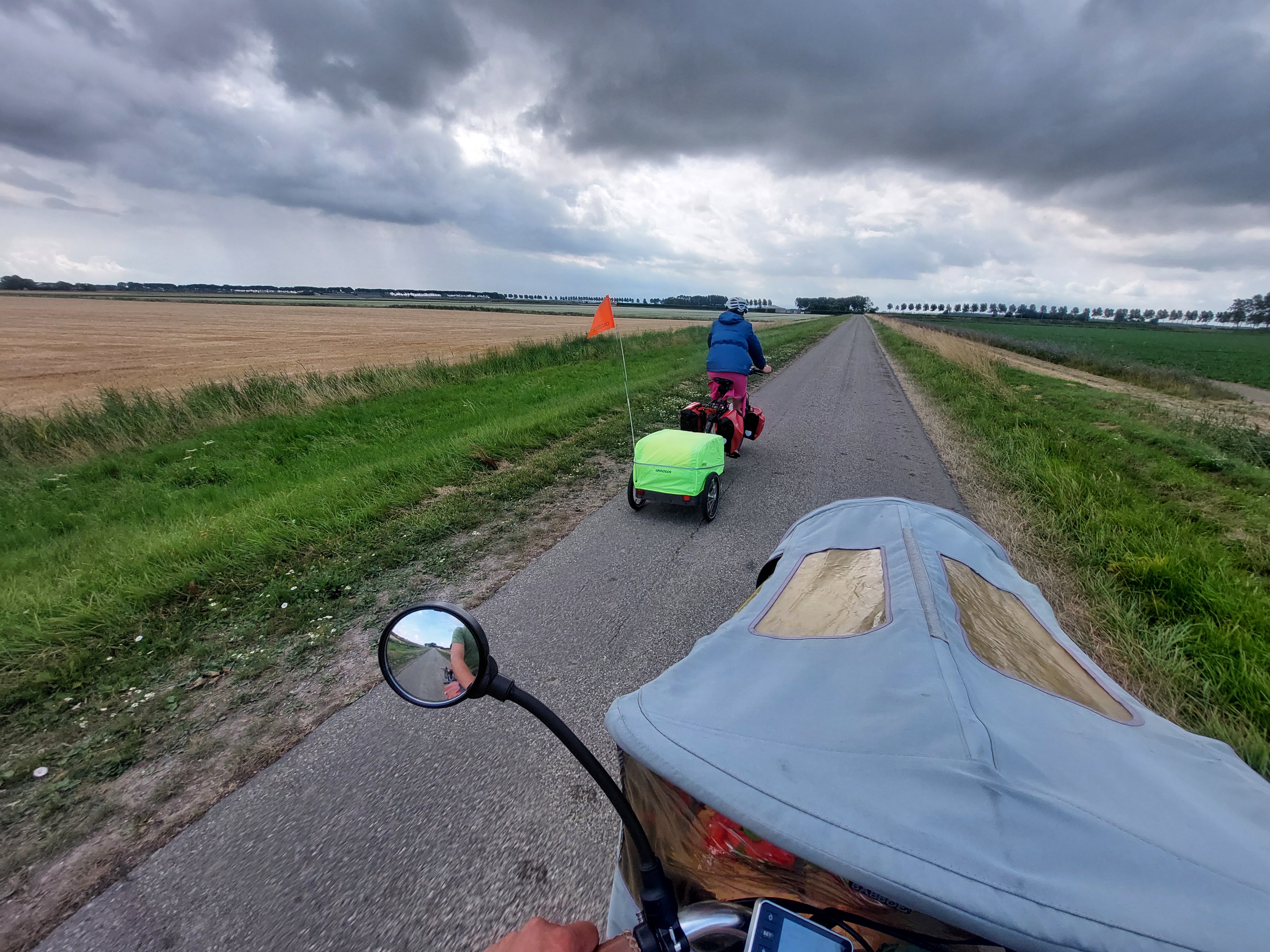 Maar de bakfiets heeft het prima gered. De tweede accu had nog 50%. Dit ondanks we stevig tegen de wind in beleven doorfietsen om onze bestemming te bereiken voor het onweer.