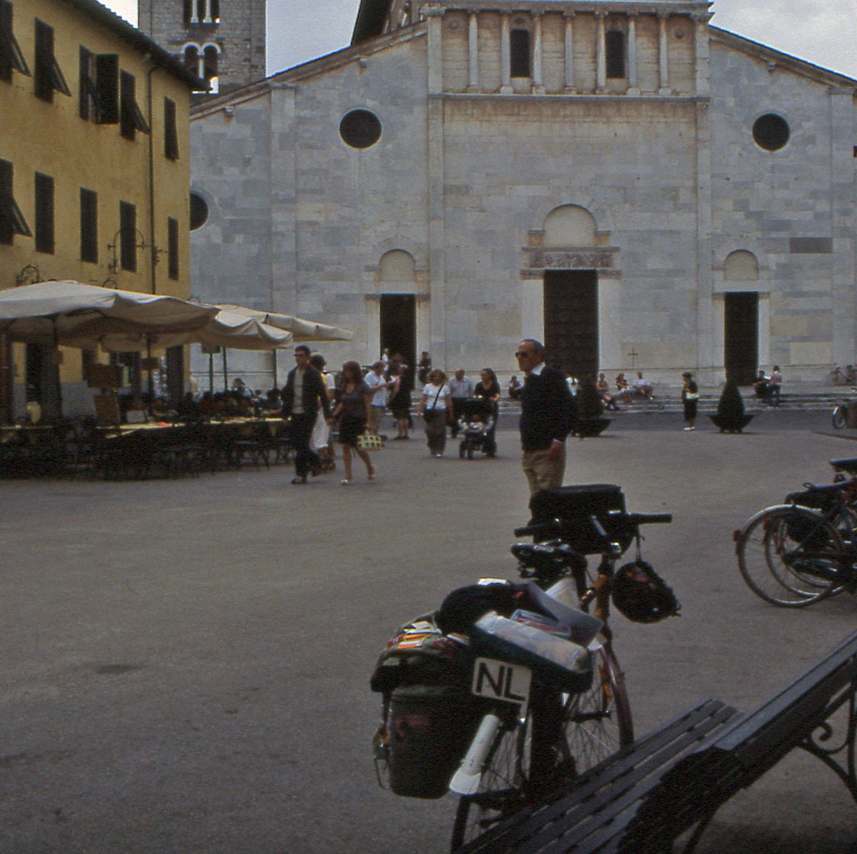 Heel goed, Tovenaar! Dacht ik al dat het te makkelijk zou zijn. Inderdaad de San Ferdiano in Lucca. Wat kon het gouden mozaïek onder de geveltop in de vroege ochtendzon prachtig schitteren. Ik sliep in de "ostello" (jeugdherberg) welke pal naast de kerk is gelegen. Op de foto van het gebouw, vanaf de stadsmuur genomen, steekt die geveltop met het mozaïek rechts boven het dak uit.