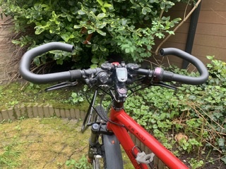 Te koop van een wereldfietser 1.76 meter, die niet meer zelf fietsen kan, een rode Travelmaster 19 inch.
