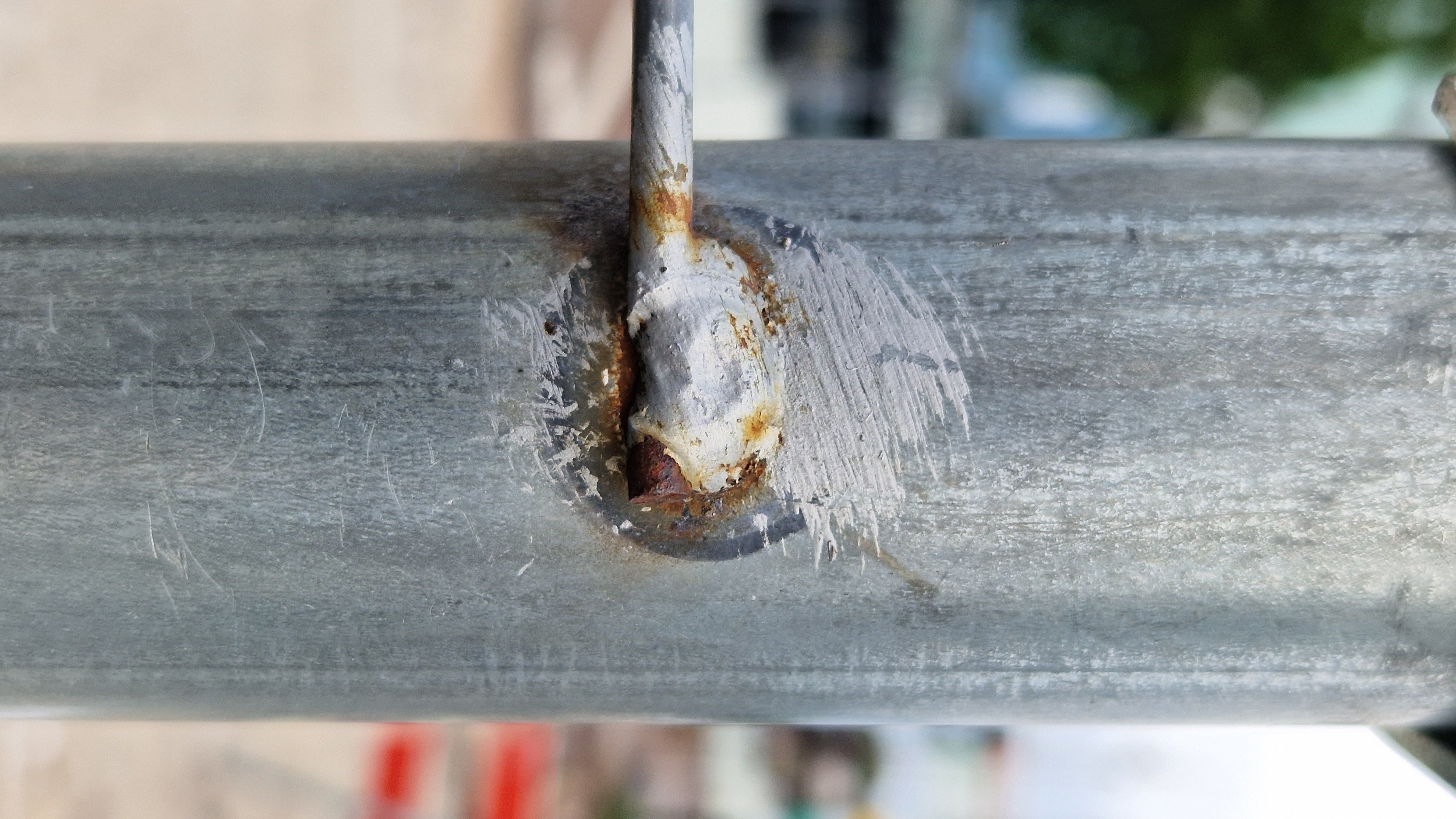 Hij was doorgezaagd en met aluminiumsoldeerdraad en flux weer aan elkaar gesoldeerd.
