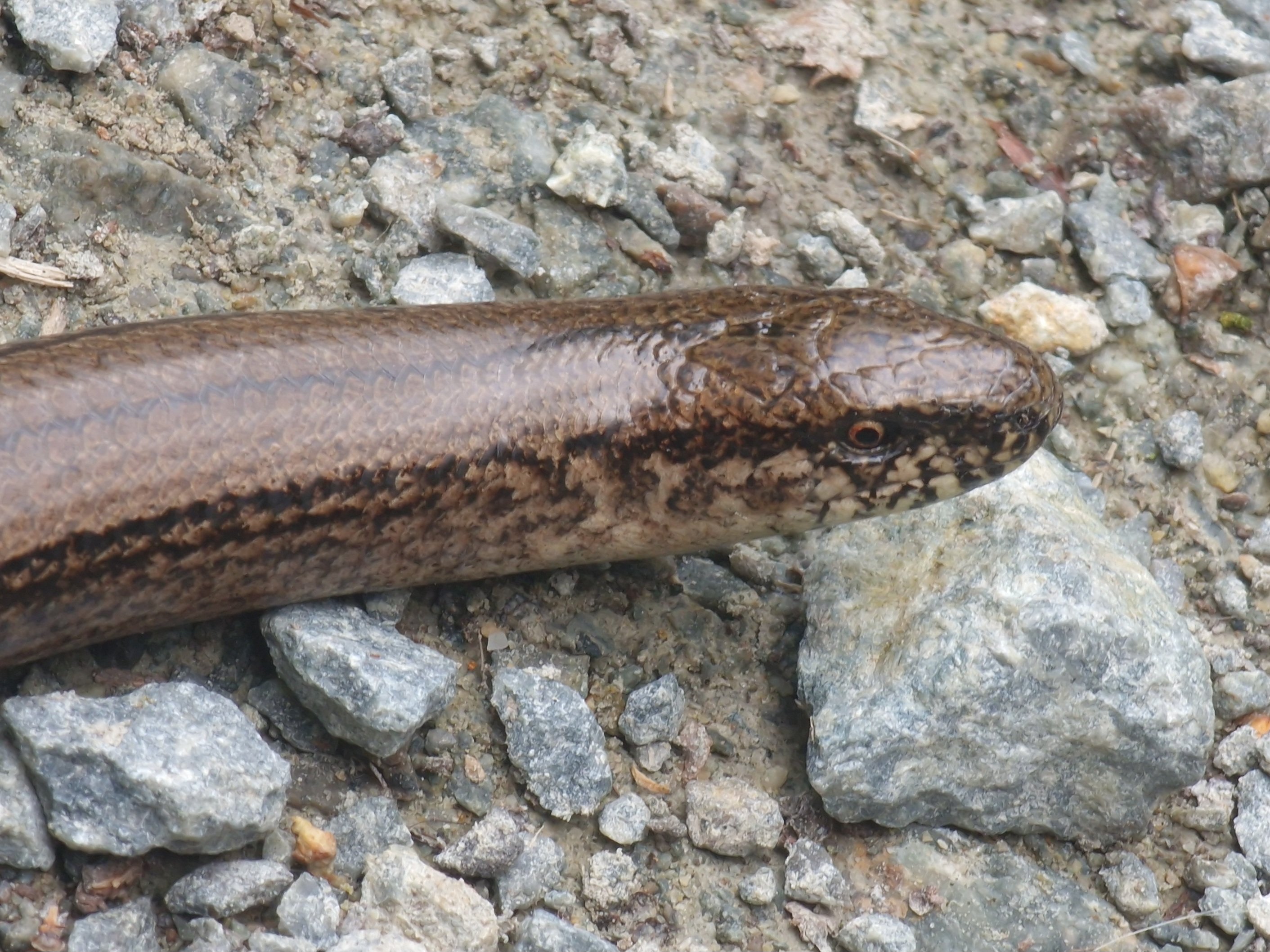 - Deze hazelworm liep/gleed me voor de voeten. Geen slang, wel een pootloze hagedis (die hier een poosje geleden al eens gepasseerd is)