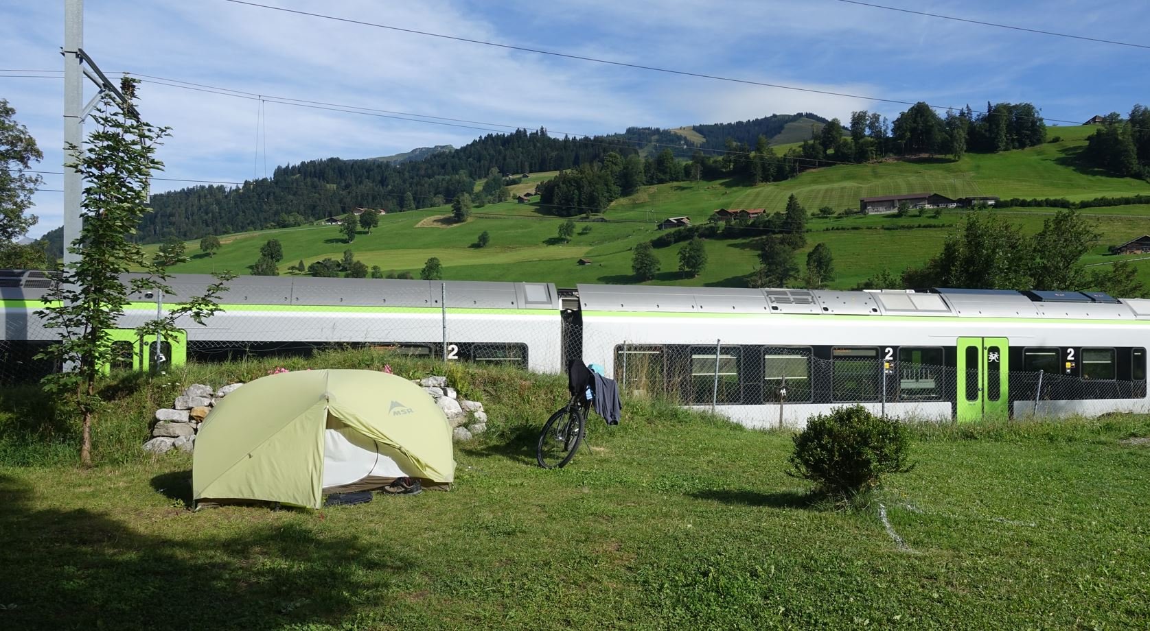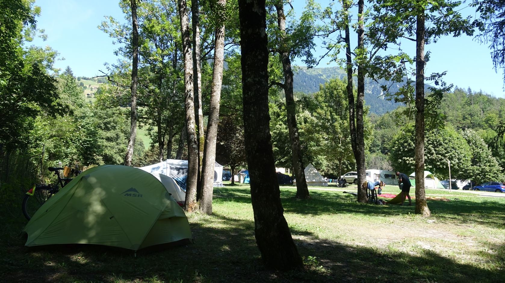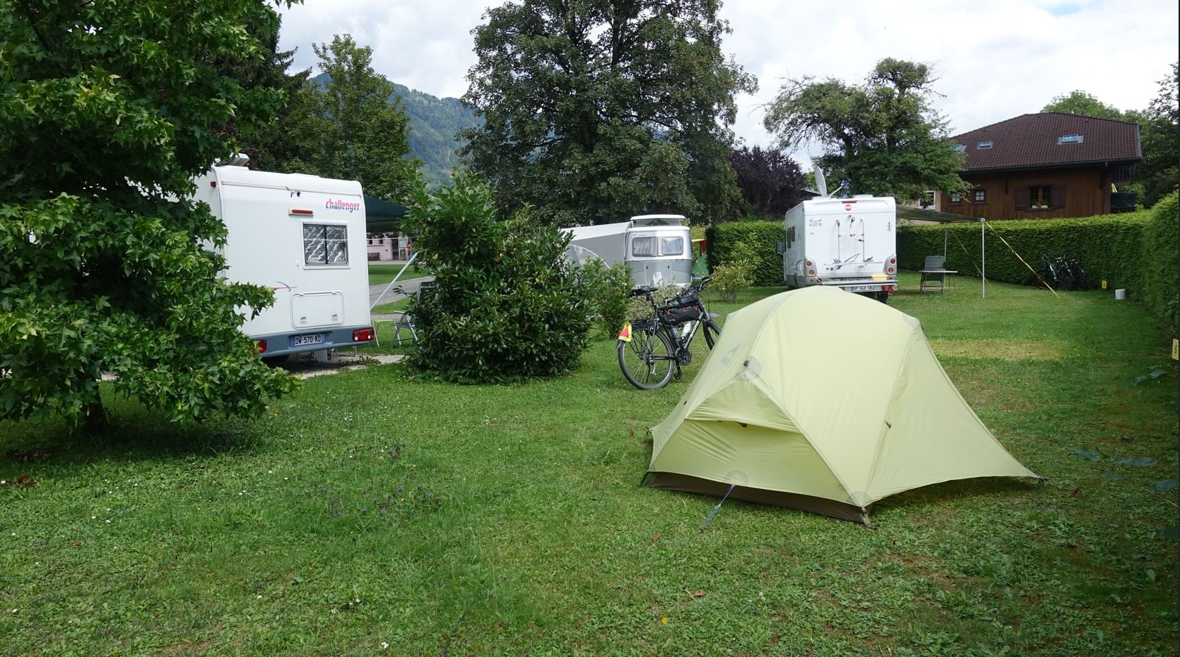 Camping in Thusis was vol maar dat gold bij lange na niet voor het tentenveldje. Daar ook de eerste vakantiefietsers ontmoet, een echtpaar uit Nederland.