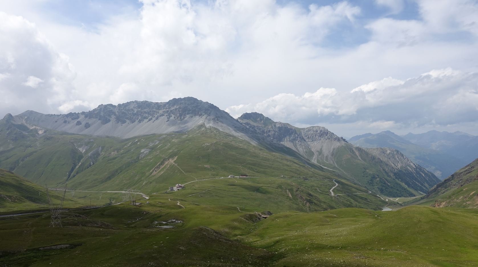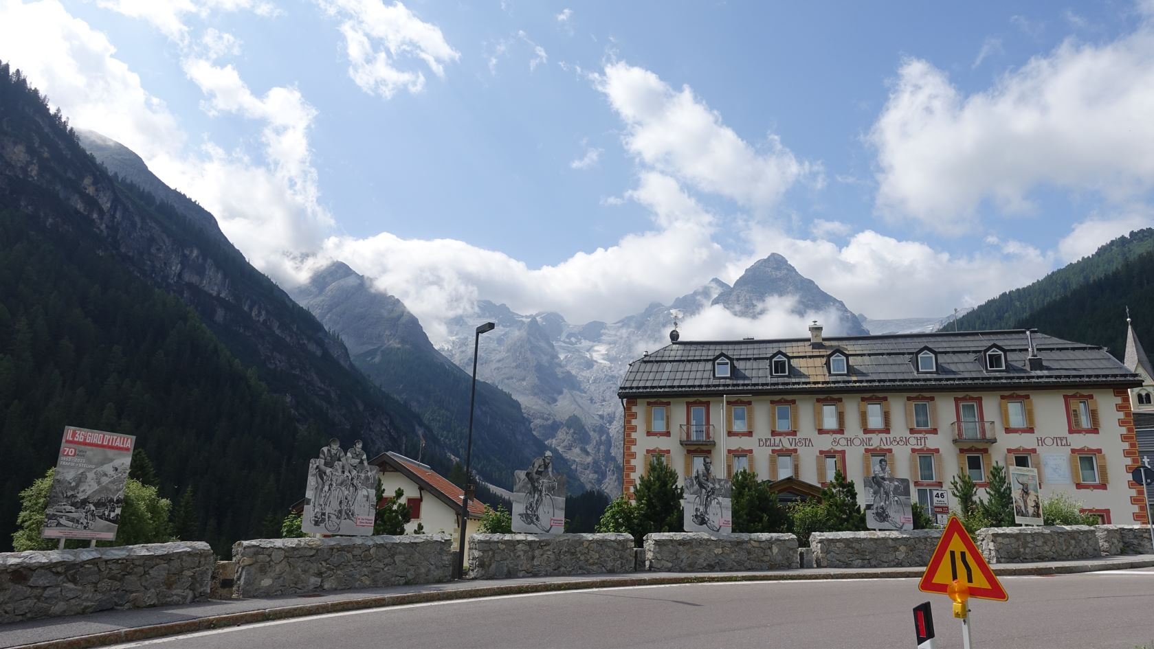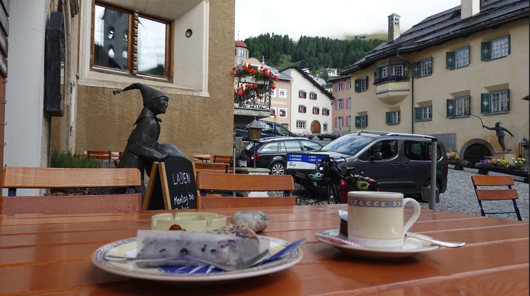 De aanloop naar de Albulapas (20 km) was liefelijk met leuke dorpjes, én koffie natuurlijk. Ik gebruik ’s ochtends op de camping mijn brander niet en ik stop dan bij de eerste de beste koffie gelegenheid. Vandaag was dat al op de camping maar een mooi café onderweg kan ik ook moeilijk weerstaan. Voor de top van de Albulapas een indrukwekkend kippenvelmoment. Eerder dit jaar was Gino Mäder hier verongelukt en er was spontaan een herdenkingsmonument opgezet.