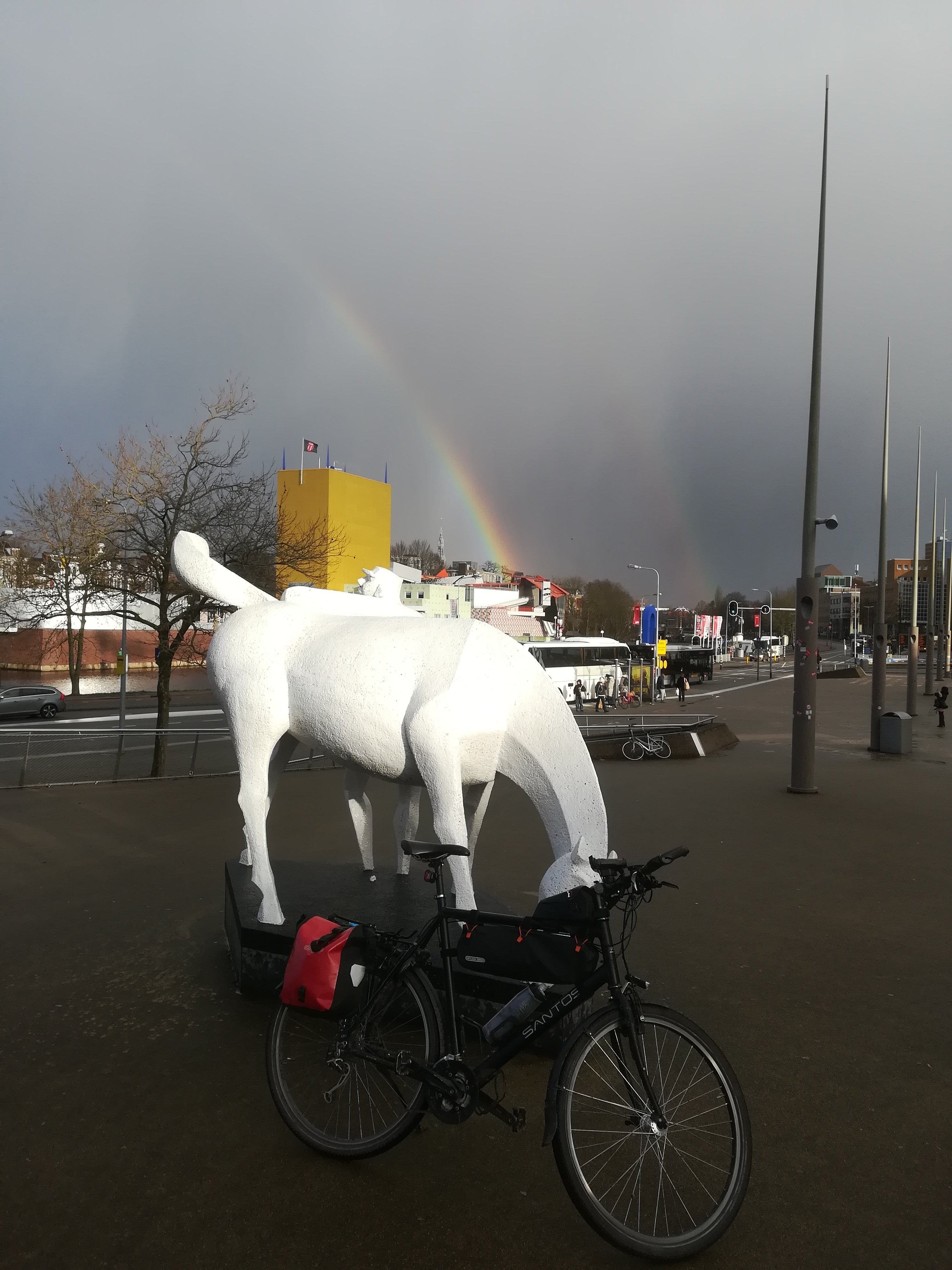 We vertrokken met z'n vieren even na tienen, richting het zuiden. Boven Norg langs naar Steenbergen voor een koffie, of twee. De route was wat korter dan anders, 54-55 km, dus op tijd thuis. De laatste 500 meter nog even wat regen wat resulteerde in een mooie regenboog, of twee. Na het afscheid naar huis, weer in een mooi zonnetje.