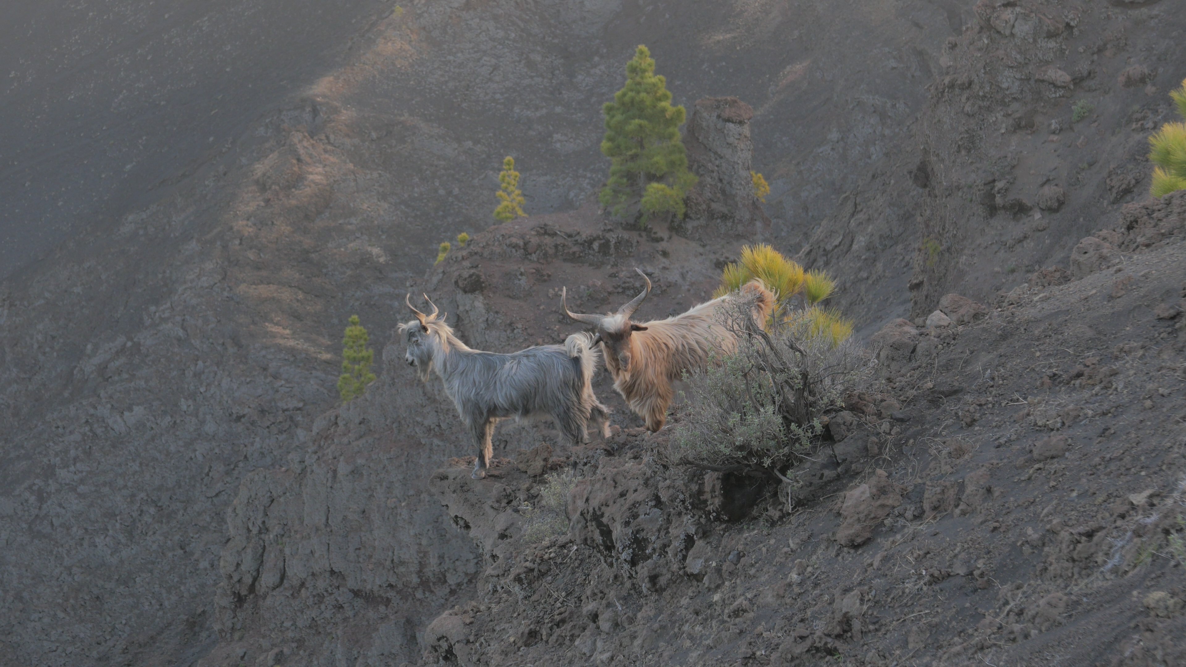 Eergisteravond kreeg ik bij de tent eenzaam bovenop de Cumbre Vieja, bezoek van een mij tot dan toe onbekende diersoort: twee duidelijk verwilderde, "cabras palmeras"