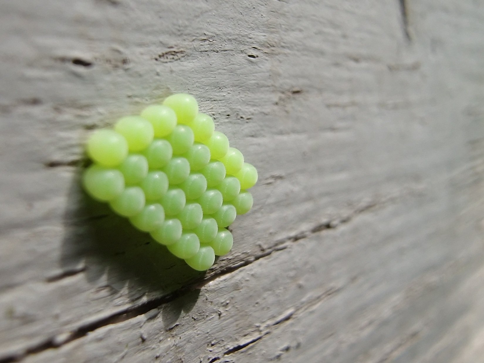 Gifgroene pingpongballetjes met machinale precisie vastgekleefd aan mijn tuinhok. Wellicht het werk van een groene schildwants.