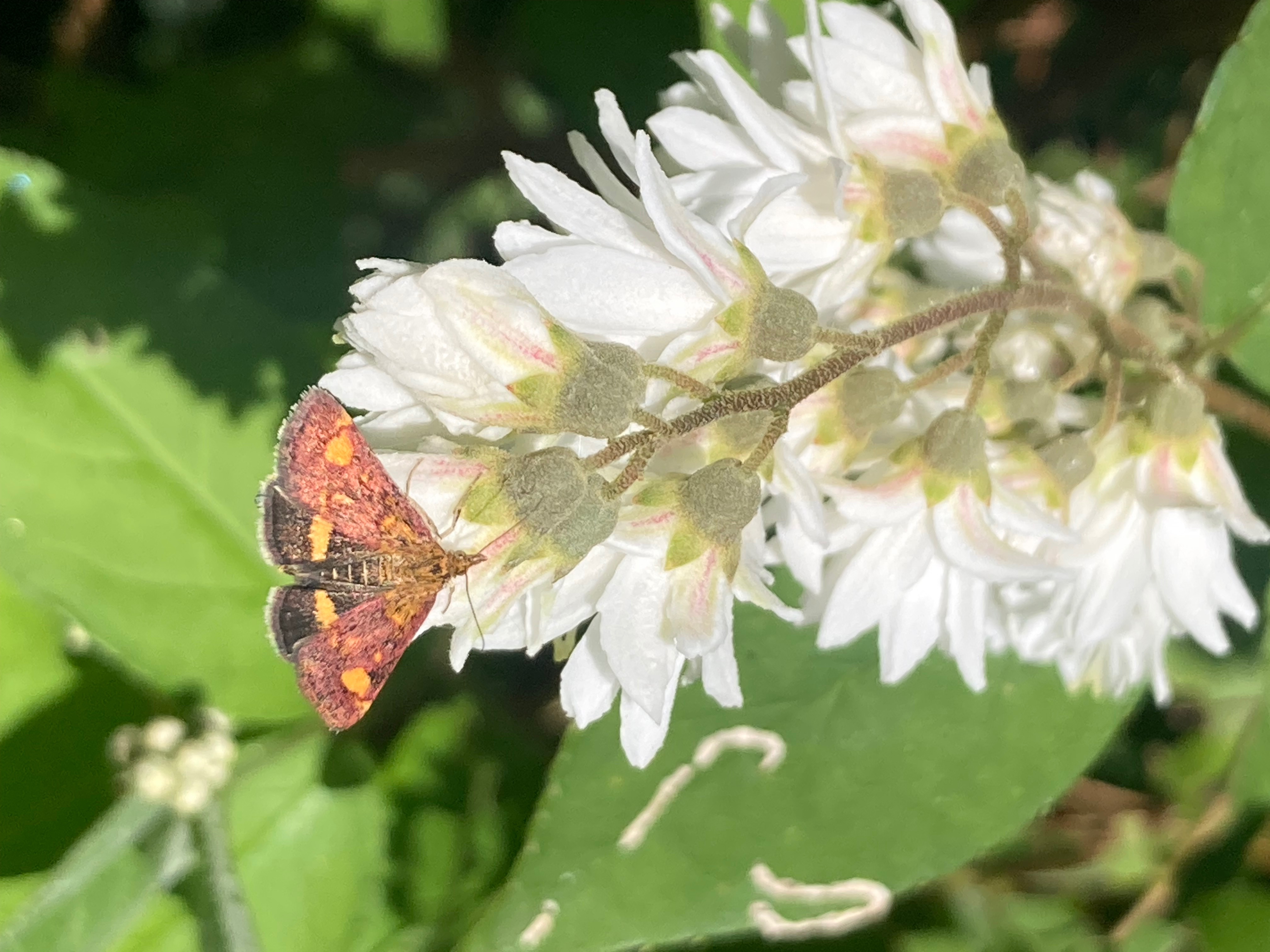 Kijk toch eens wat een schattig vlindertje op de deutzia. Het beestje is misschien wel 12mm groot.