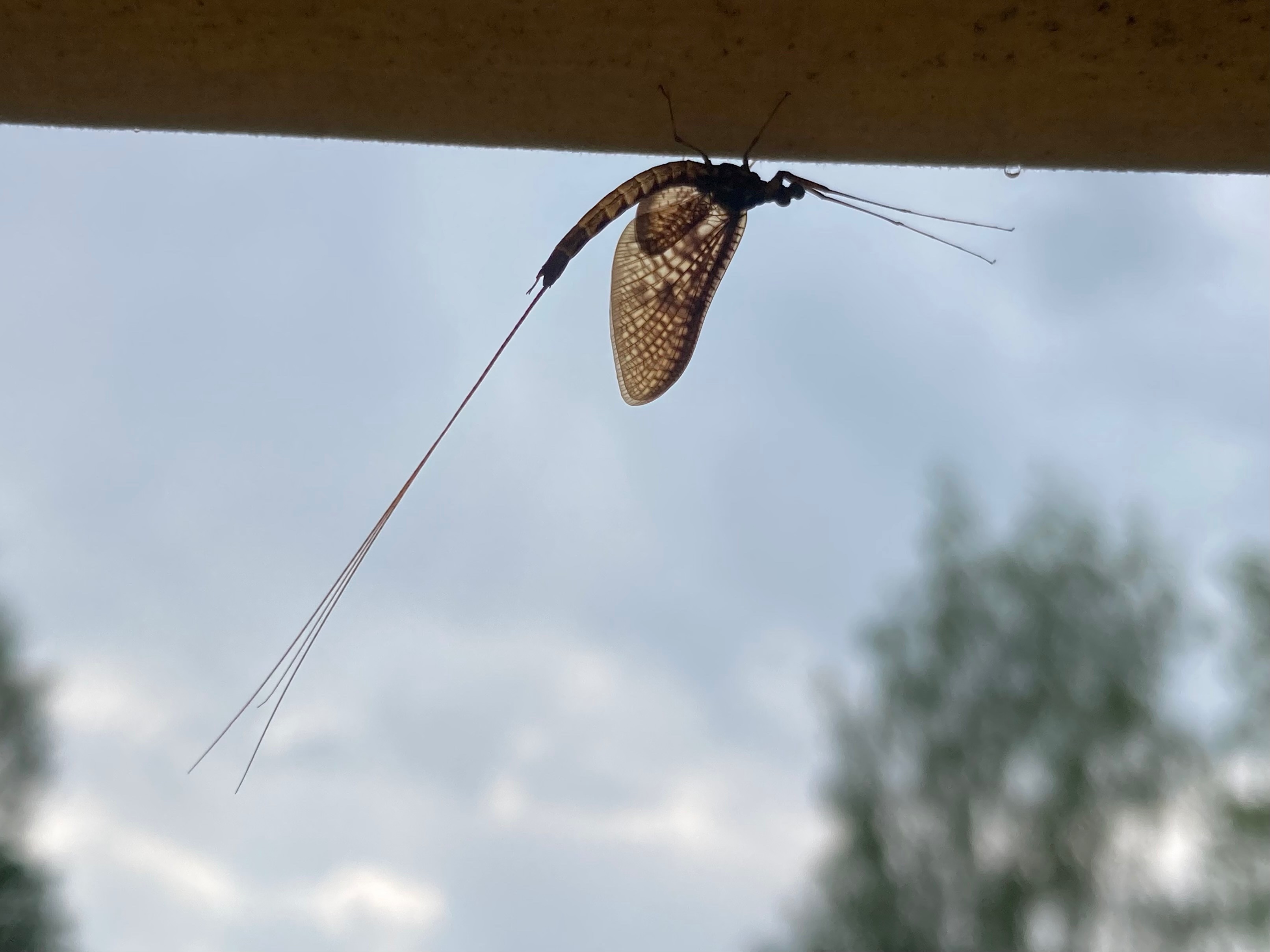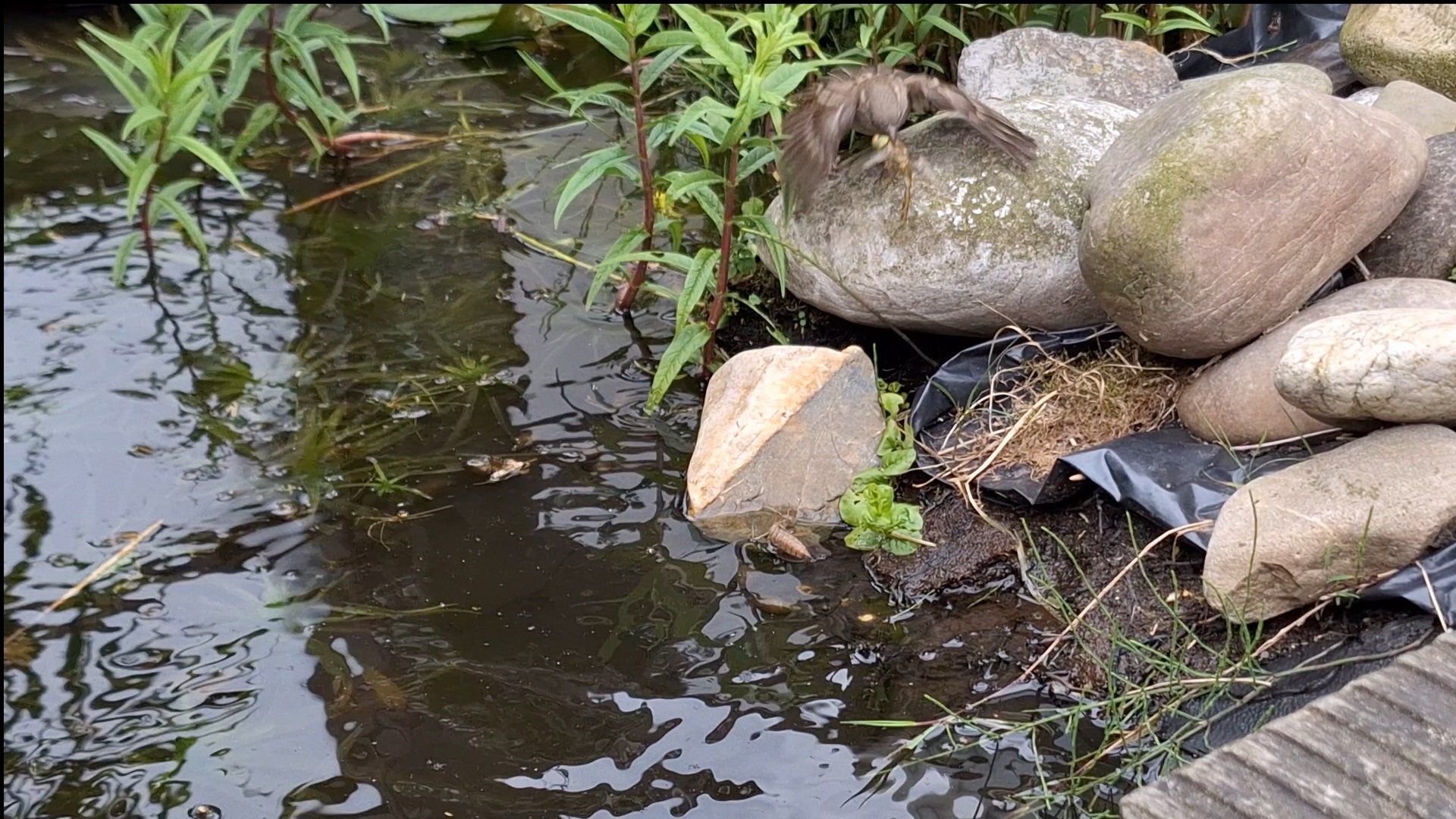 Bij ons in de vijver. De Vroegenglazenwasser komt uit de vijver en is al uren bezig om het volgende leven te beginnen. Wil net wegvliegen en een mus ziet dat duikt, mist zijn prooi en komt terug.