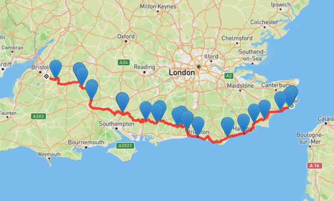 Woensdagochtend begint onze eerste fietsdag in/rond Dover en het plan is om tegen zondagavond ten laatste toe te komen in Bristol/Bath. 5 volle fietsdagen dus, waar we idealiter max 90km per dag willen fietsen. Iets meer mag altijd, maar mijn broer is een iets minder gevorderde fietser dan mij dus ik wil het ook niet te stevig maken. Mocht de route toch (veel) langer zijn dan 450km kan er eventueel wel met de trein een stuk ingekort worden.