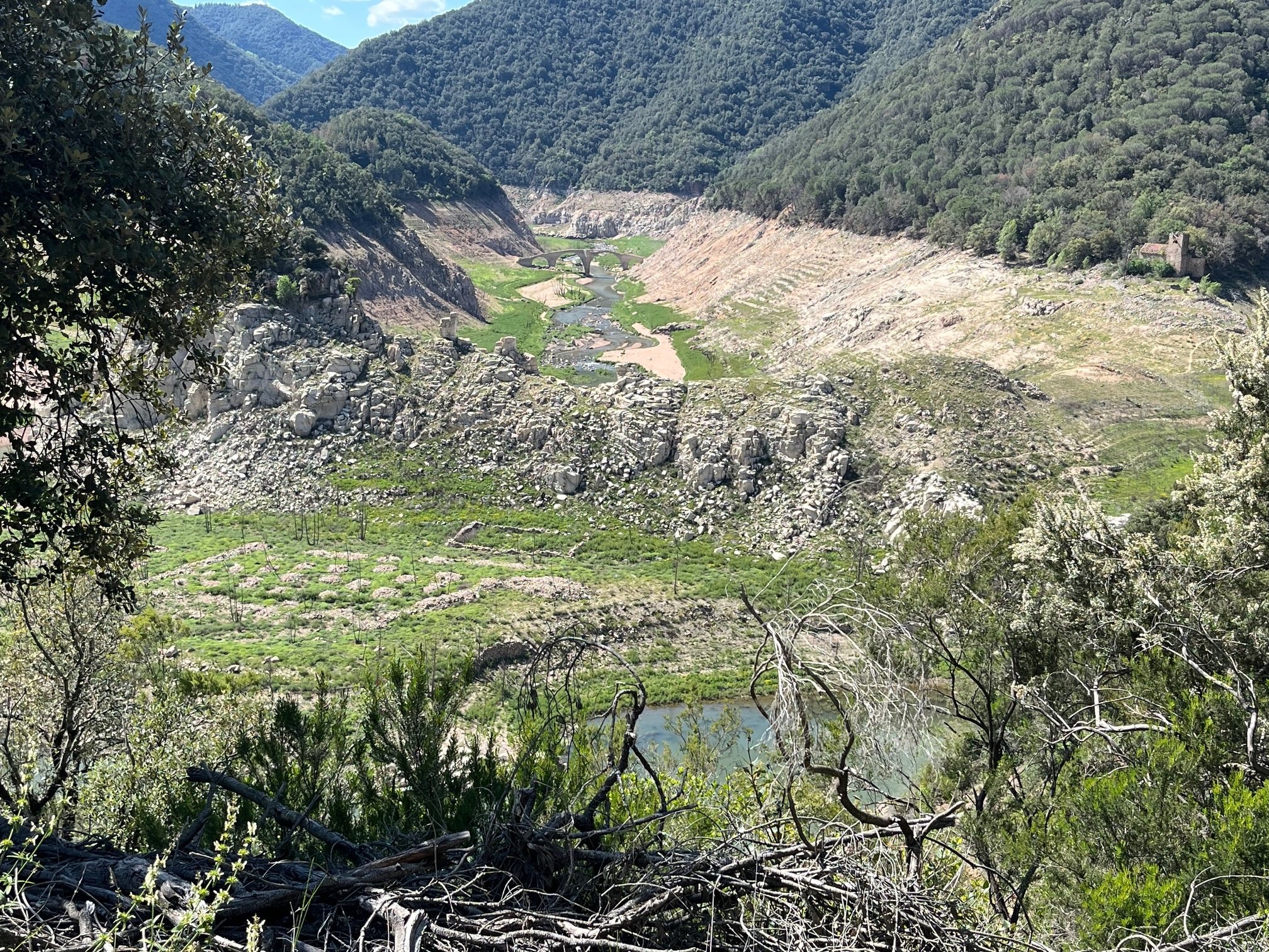 Een dramatische foto eigenlijk met die mooie boogbrug daar in de verte. Het stuwmeer moet al langere tijd leeg staan, gezien de hoeveelheid groen op de bodem. Lago di Vogorno was leeg voor onderhoud (zal niet zo lang geduurd hebben). Ik denk nu aan een stuwmeer in Catatonie, daar zijn lege stuwmeren vanwege de extreme droogte. Dus mogelijk een van deze.