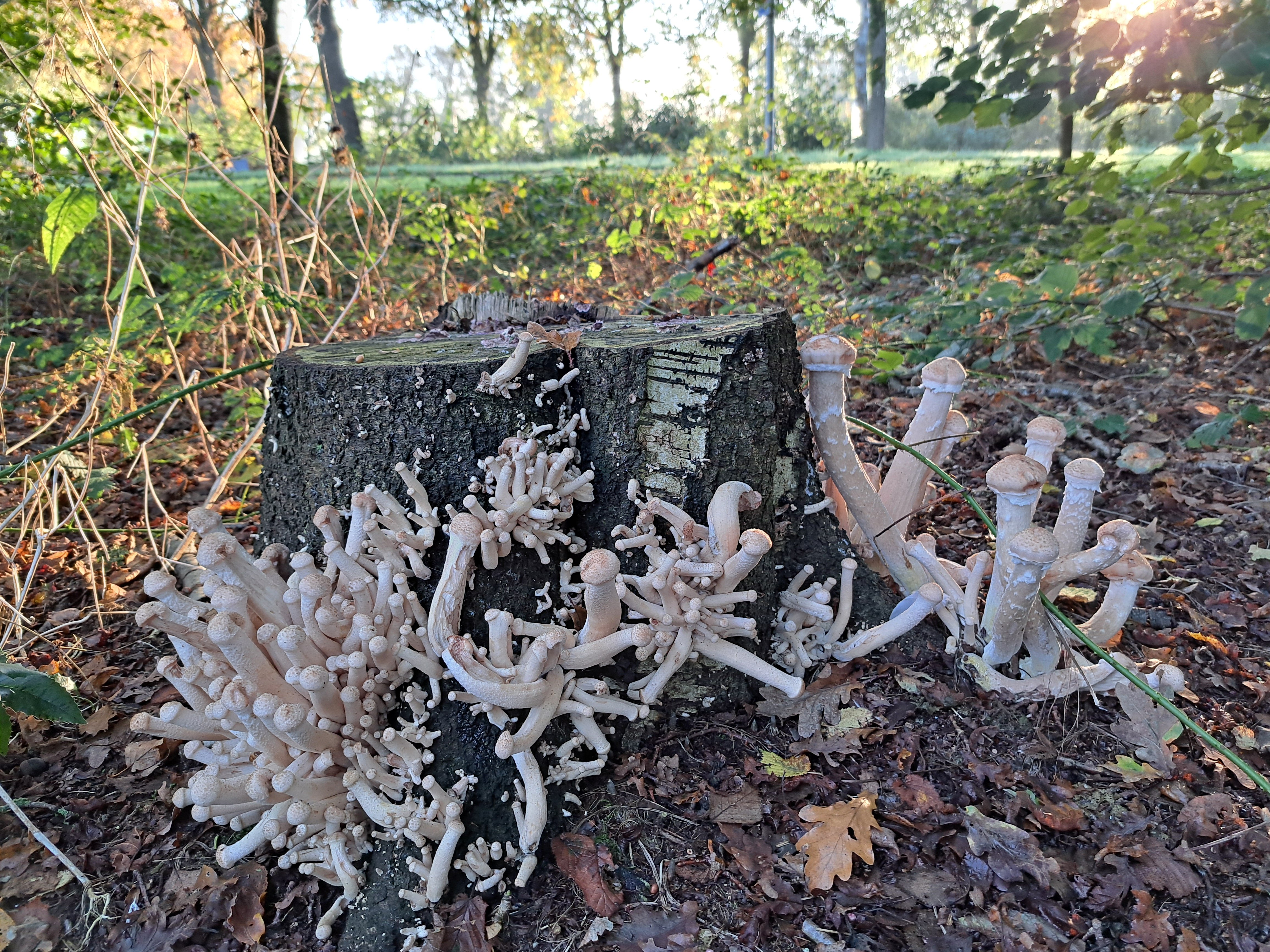 Nice! Ik dacht eerst aan een soort honingzwam met onderontwikkelde hoeden, maar dat is het wellicht niet. Obsidentify komt er ook niet uit. In ieder geval hebben deze exemplaren een hoog fallusgehalte. Ik zal het eens aan een collega (een mycologe) vragen.