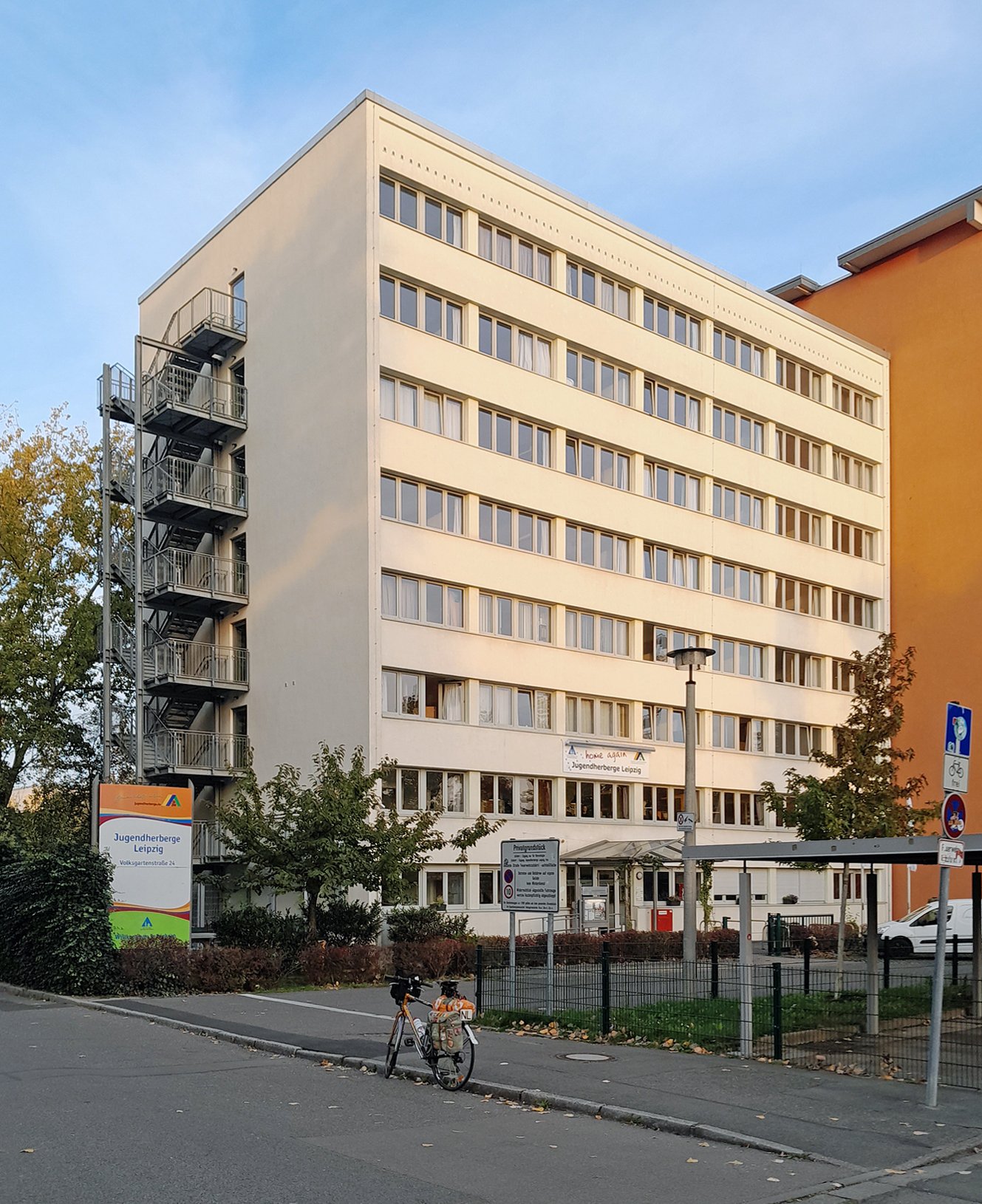 Aan nummerbord auto s denk ik dan meteen aan Leipzig. Daar jeugdherberg gezocht en dan sta je volgens mij naar dit gebouw te kijken: