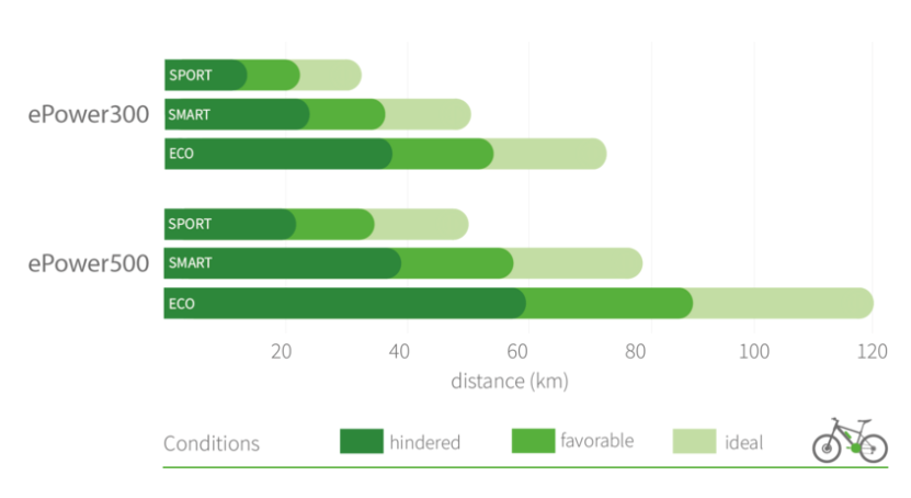 Waarschijnlijk is de steun nog hoger. Pendix specificeert voor de 300 Wh accu in de Eco stand een range van 55 km in 'favorable' omstandigheden (waarschijnlijk: vlak, gewoon asfalt, rondje met lage windsnelheid, snelheid ca. 20 km/h) tot 75 km in 'ideal' omstandigheden (waarschijnlijk : vlak, goedlopend asfalt, windstil, snelheid 15 km/h). In het eerste geval duurt dat 55/20 = 2,75 h ; de motor levert dan ongeveer 0,8x300/2,75 = 90 W steun. In het tweede geval duurt de rit 75/15 = 5 h ; de motor levert dan 0,8X300/5 = 48 W steun. Hierbij heb ik aangenomen dat de accu van 90% naar 10% ontladen wordt ; daarom de factor 0,8.
