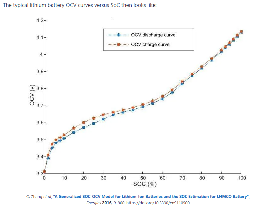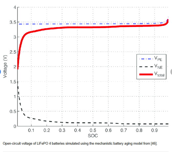 De ene lithium-accu is de andere niet. Op de Pendix-site kon ik niet veel meer vinden dan 'Lithium-ion'. Zoeken met 'pendix lithium iron phosphate' gaf geen enkel zinvol resultaat. De Li-FePO4 accu is het dus waarschijnlijk niet. Dan is het meest waarschijnlijke dat het een Lithium-Nickel-Manganese-Cobalt Oxide accu is (LNMCO). De 'open cell' spanning (dwz in onbelast toestand) is als functie van de laadtoestand (SOC) echt niet lineair. Bij 60% kom je dan op ongeveer 3.75 V. Mijn punt is dat in het gebied van 40-60% de curve erg vlak loopt en dus weinig informatie geeft over de laadtoestand.
