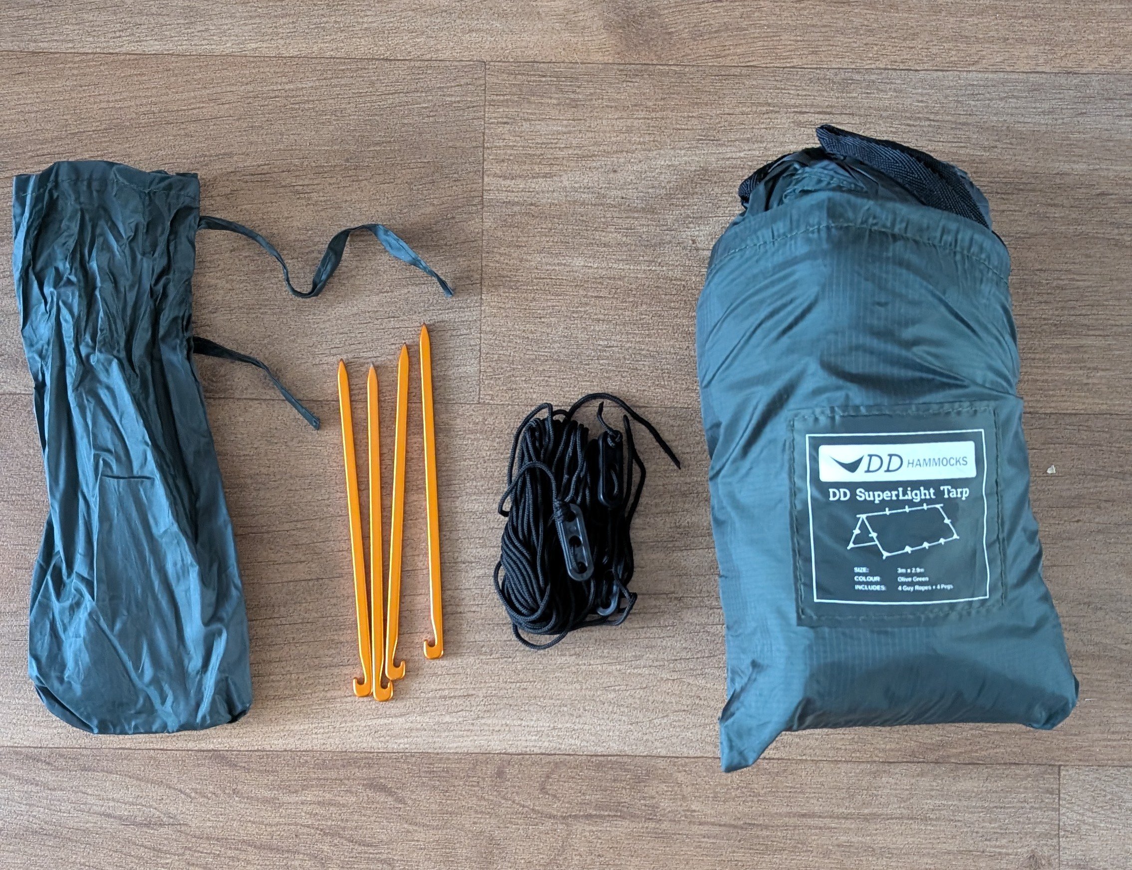 Deze tarp van DD Hammocks wordt geleverd inclusief superlight haringen en scheerlijnen.