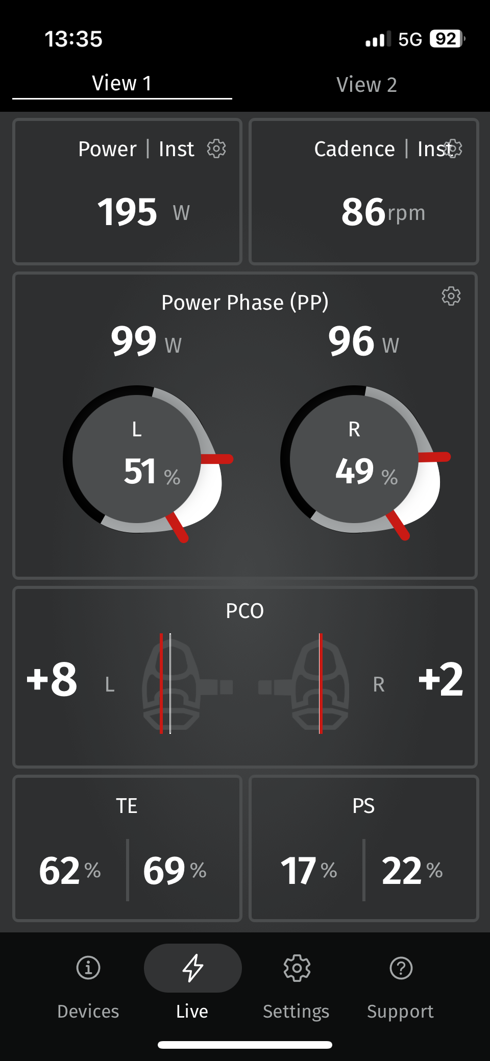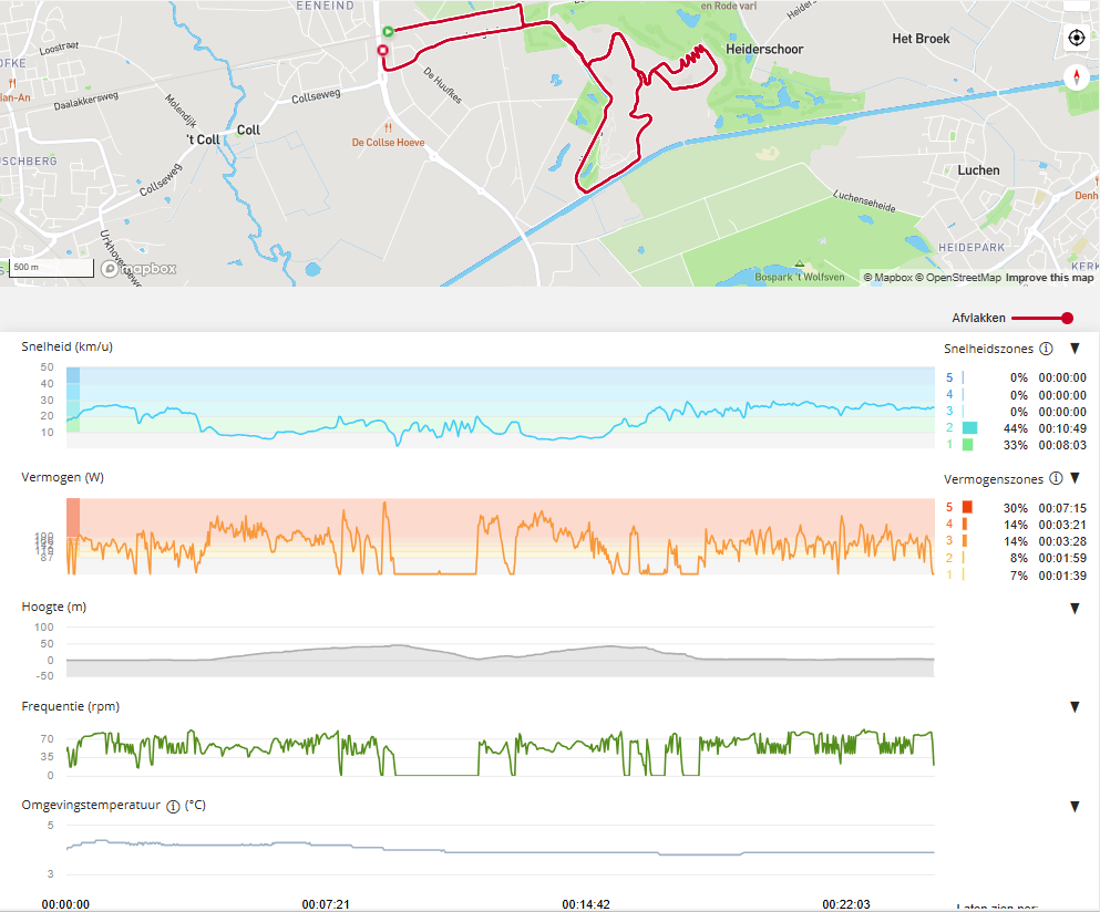 Ik zag in mijn eerste proefritten dat ik links meer kracht produceer dan rechts, een verschil ca. 5%. Daar was ik me niet van bewust. Het zal waarschijnlijk ook wel niet meer te corrigeren zijn, gezien de leeftijd. Ook zie ik dat mijn linkervoet systematisch off-center kracht zet. Toen ik daar op lette, zag ik dat mijn schoen ook wat scheef staat. Dat komt waarschijnlijk door het plaatje onder de schoen, waar het SPD-pedaal op inklikt. Daar kan ik wél wat aan doen.