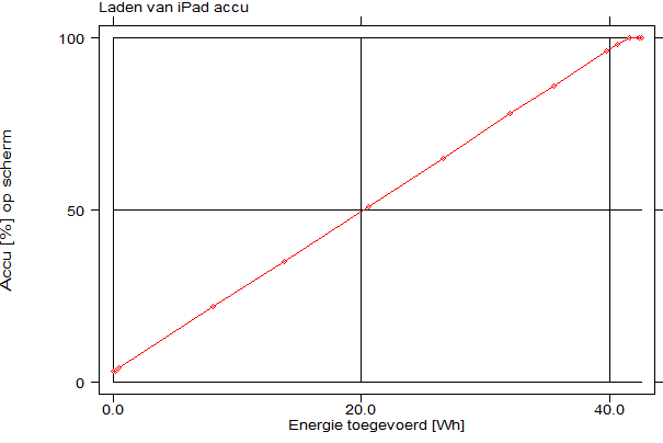 Op een Apple 'community' site zag ik dat de iPad accu 40,9 Wh is. De gemeten waarde is zinnig en bruikbaar als vergelijking. Maar de meting overschat de resterende capaciteit door de verliezen bij het laden.